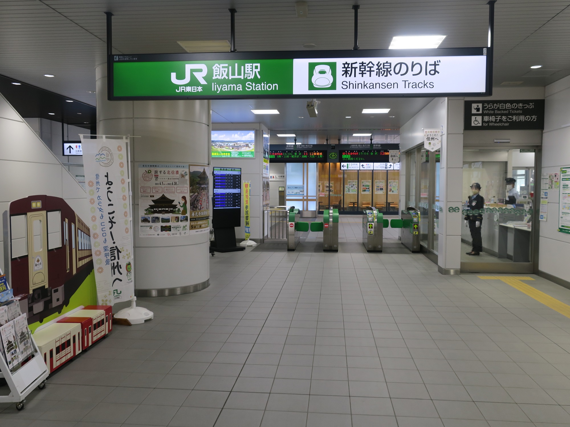 飯山駅では、新幹線改札口と、在来線改札口が分かれています。このため、北陸新幹線からJR飯山線に乗り換える(またはその逆)方も、一旦新幹線改札口を出てから在来線改札口を通る(またはその逆)必要があります。