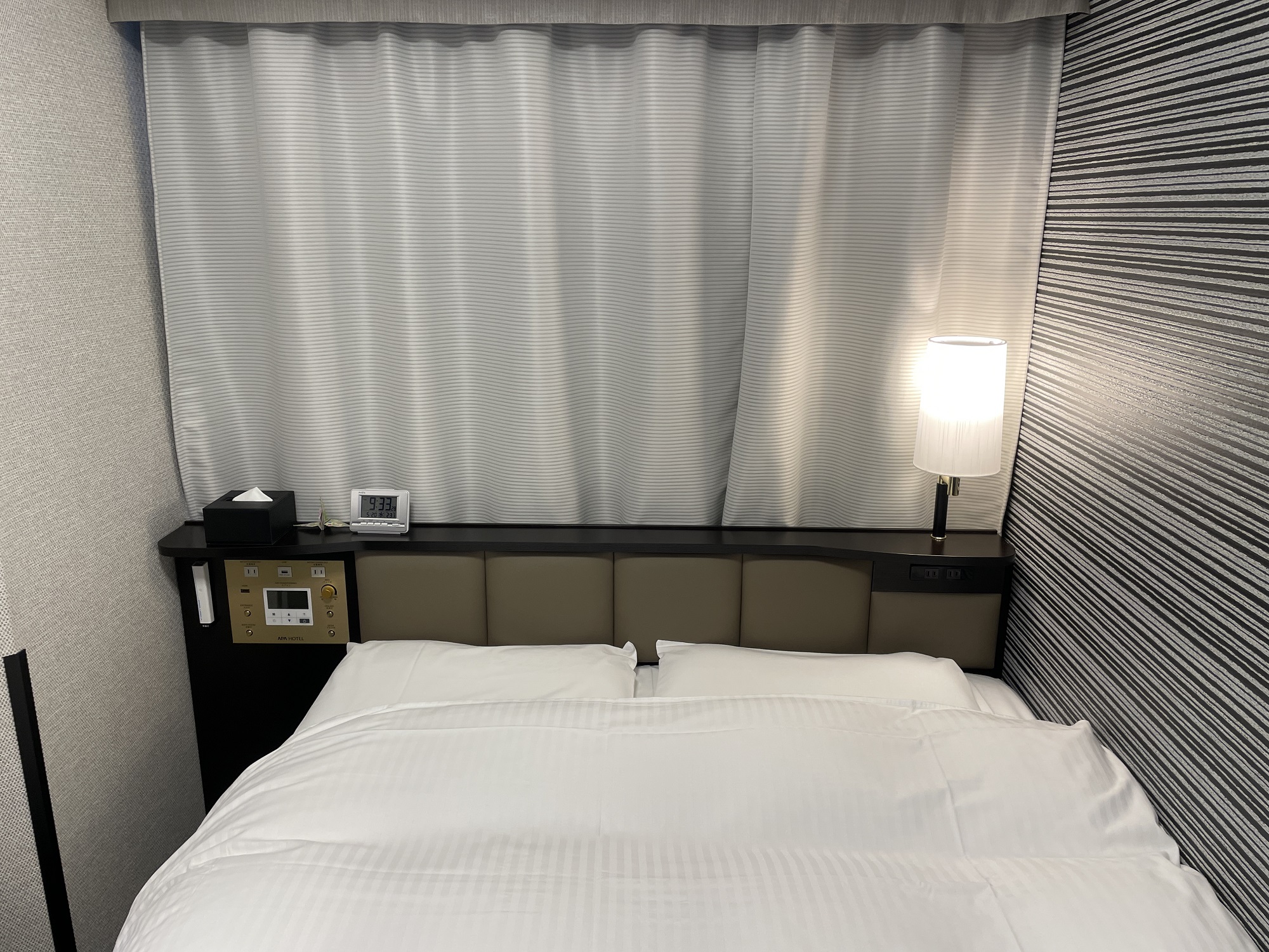 枕元です。ACコンセントやUSBポート、照明とエアコンのスイッチ類があります。また、ティッシュと目覚まし時計、非常灯があります。