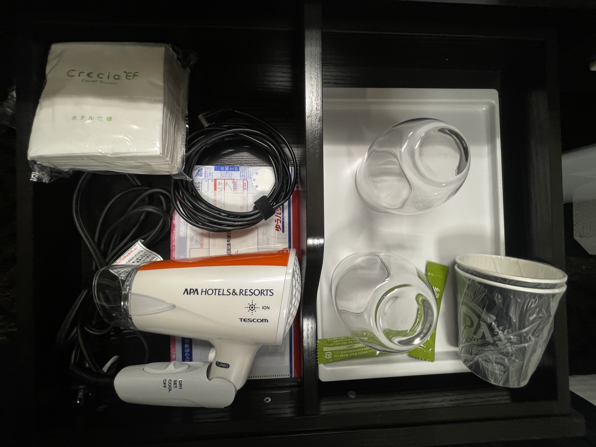 引き出しの中には、ドライヤーとLANケーブル、コップがあります。欲を言えば、マグカップが欲しいのですが…