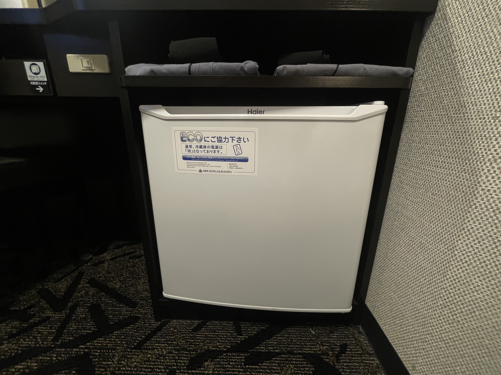 デスク下には、部屋着と冷蔵庫があります。冷蔵庫の中は空で、スイッチを切ることもできます。