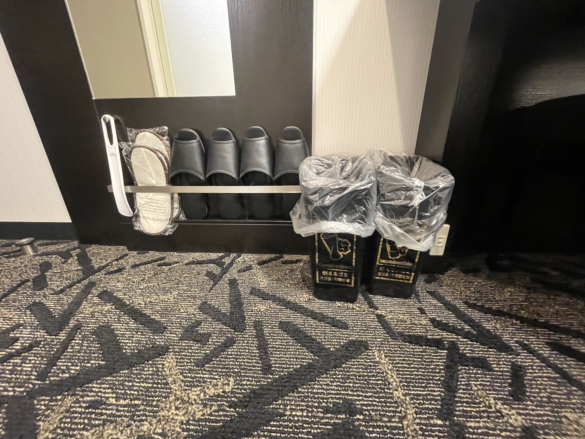 デスク下にはACコンセントとごみ箱、スリッパがあります。キューティー吉本的には、加湿空気清浄機を付けて欲しかったです。