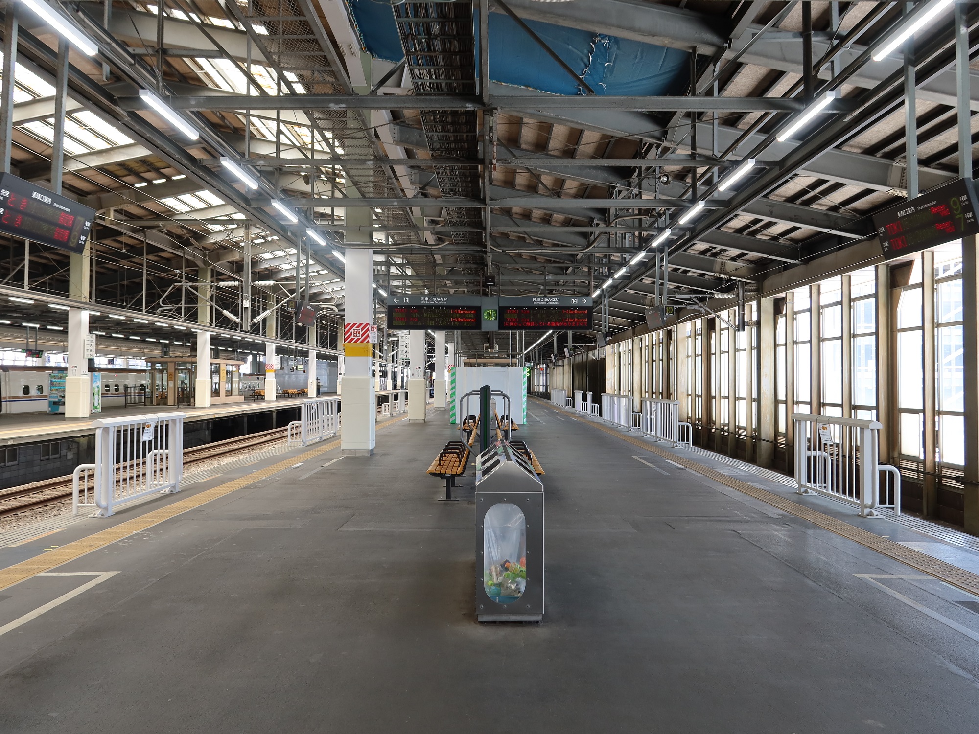 在来線ホームです。線区や行先ごとに分かれているわけではなく、ホームには〇〇線といった記述はありません。