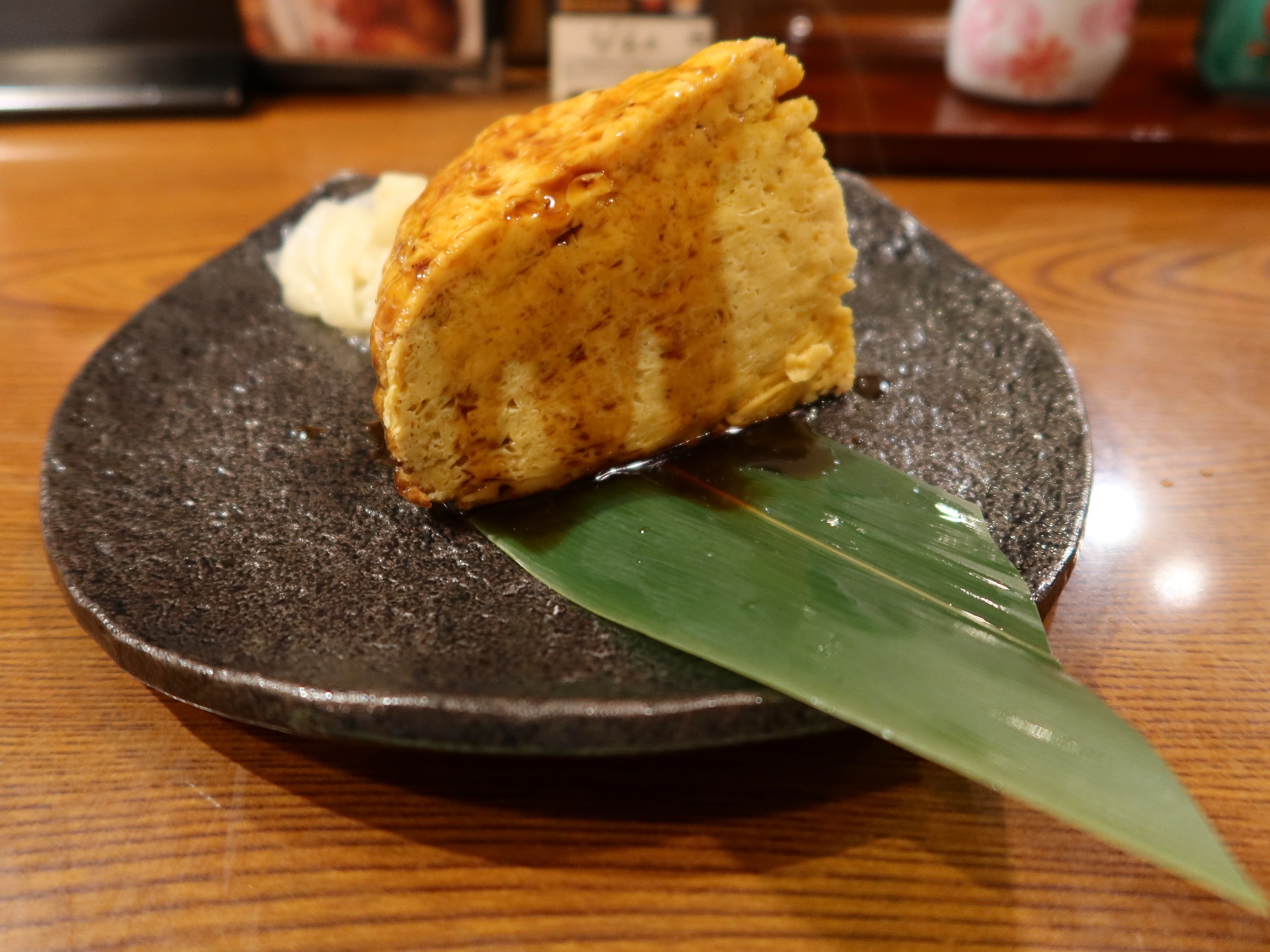 最初に頼んだのが、釜揚げ玉子焼き。ご覧の通り、まるでケーキのようなビジュアルでして、ちょっとこの形の玉子焼きは見たことなかったです。