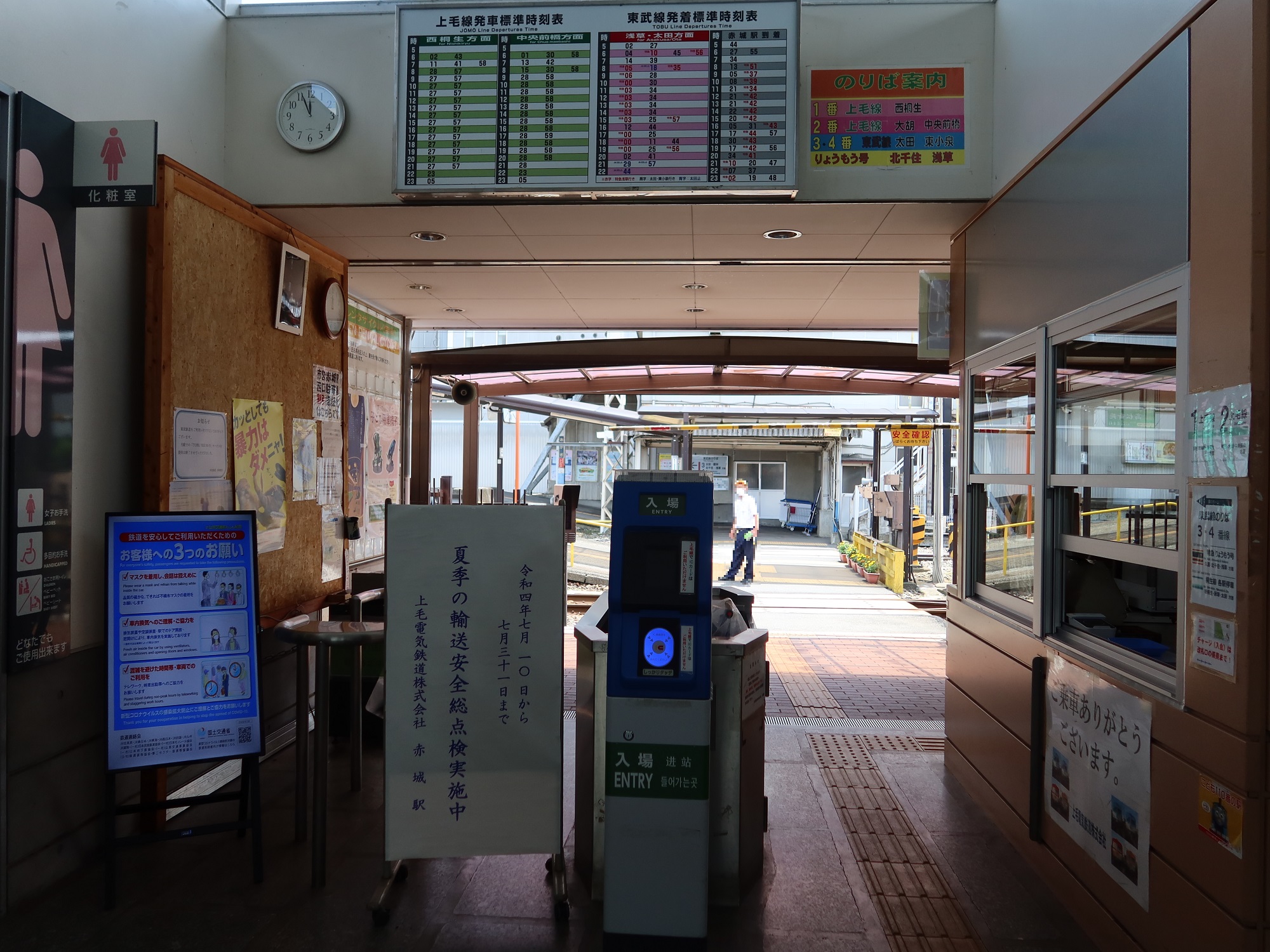 赤城駅は、上毛電鉄と東武鉄道の共同駅です。このため、改札口は一つです。また、上毛電鉄のホームと東武鉄道のホームは、構内踏切でつながっています。