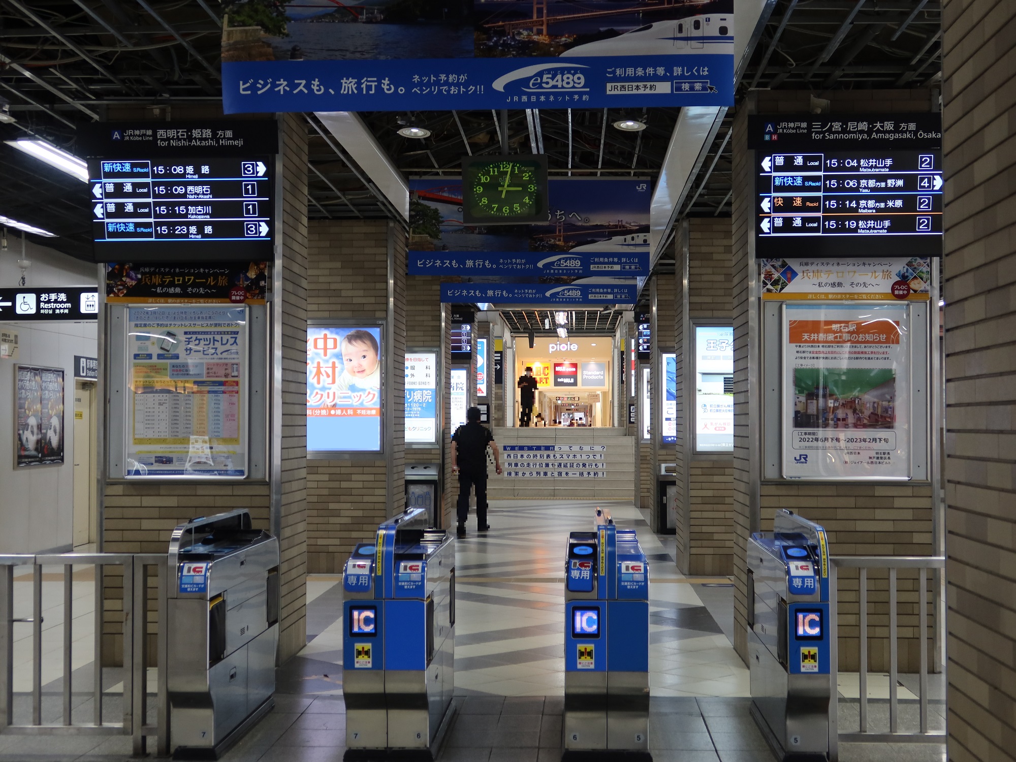 JR神戸線(正確には山陽本線)の明石駅です。その名の通り、兵庫県明石市の中心駅でして、山陽明石駅との乗換駅です。