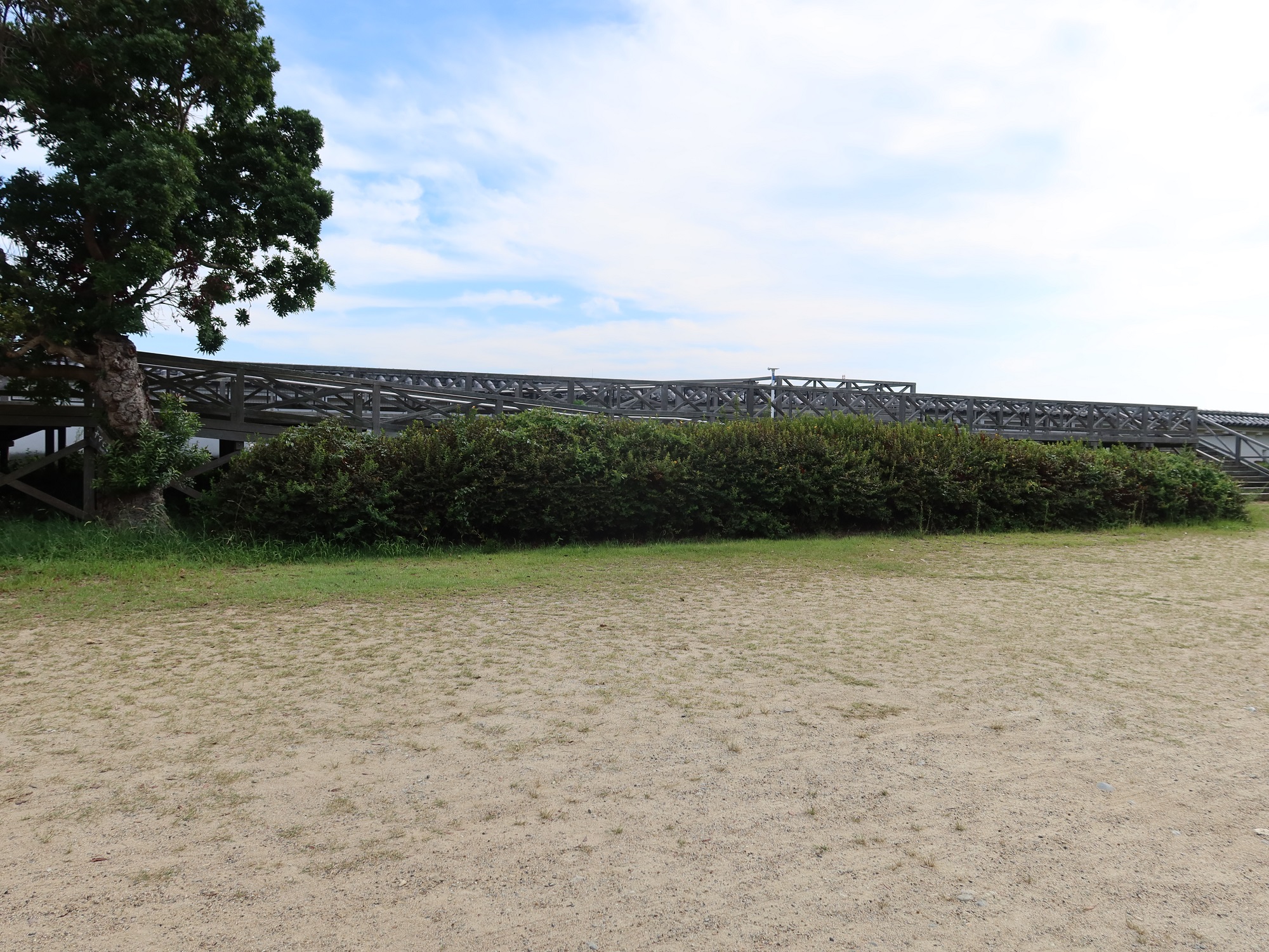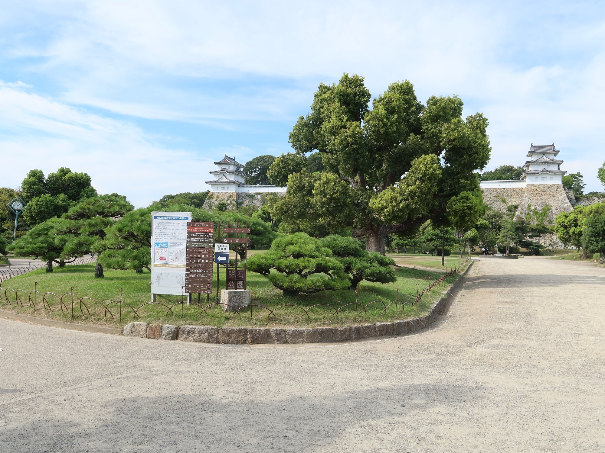 入口を入った先に、芝生の広場があります。ここからだと、坤櫓と巽櫓がはっきりと見えます。