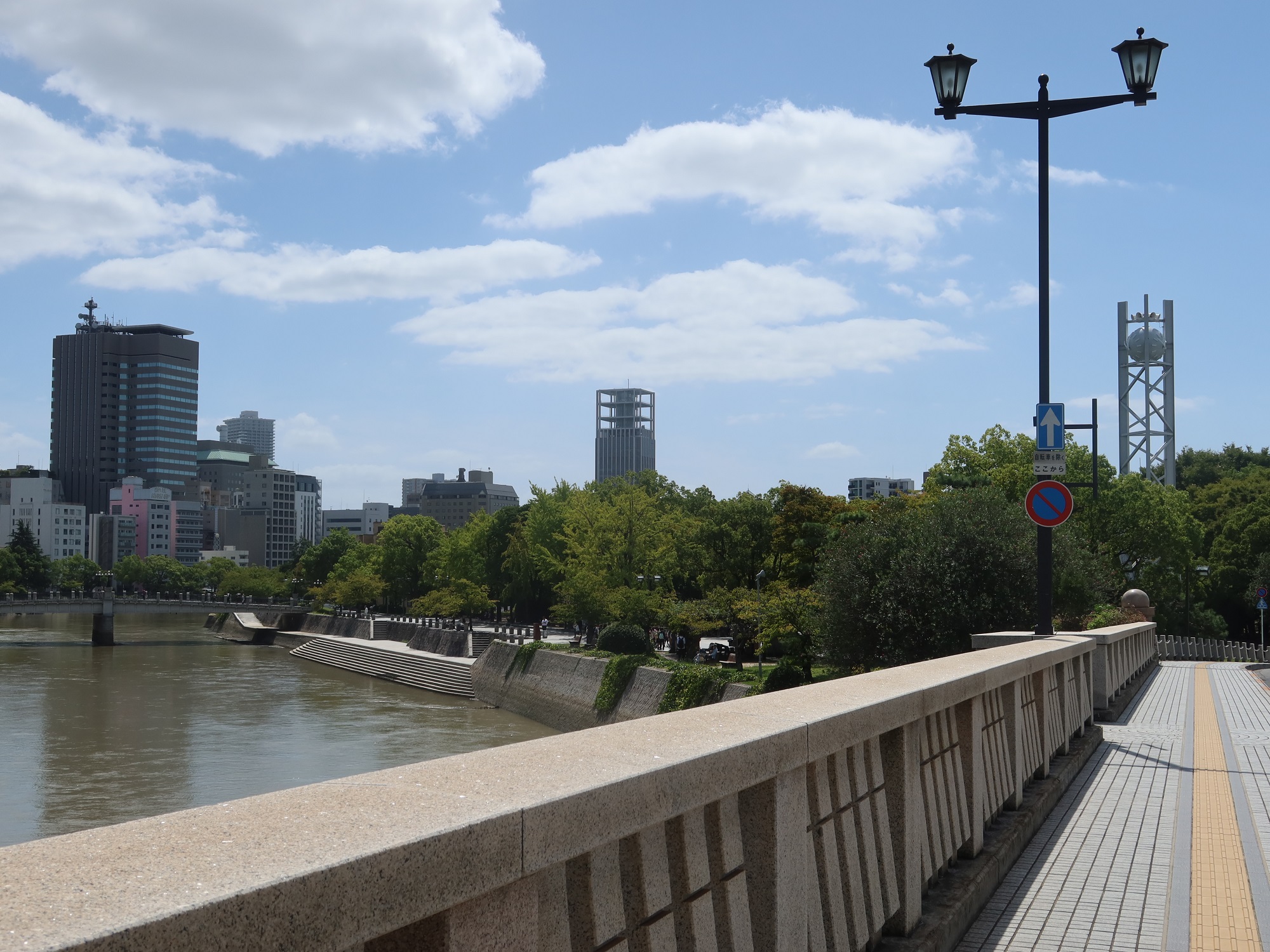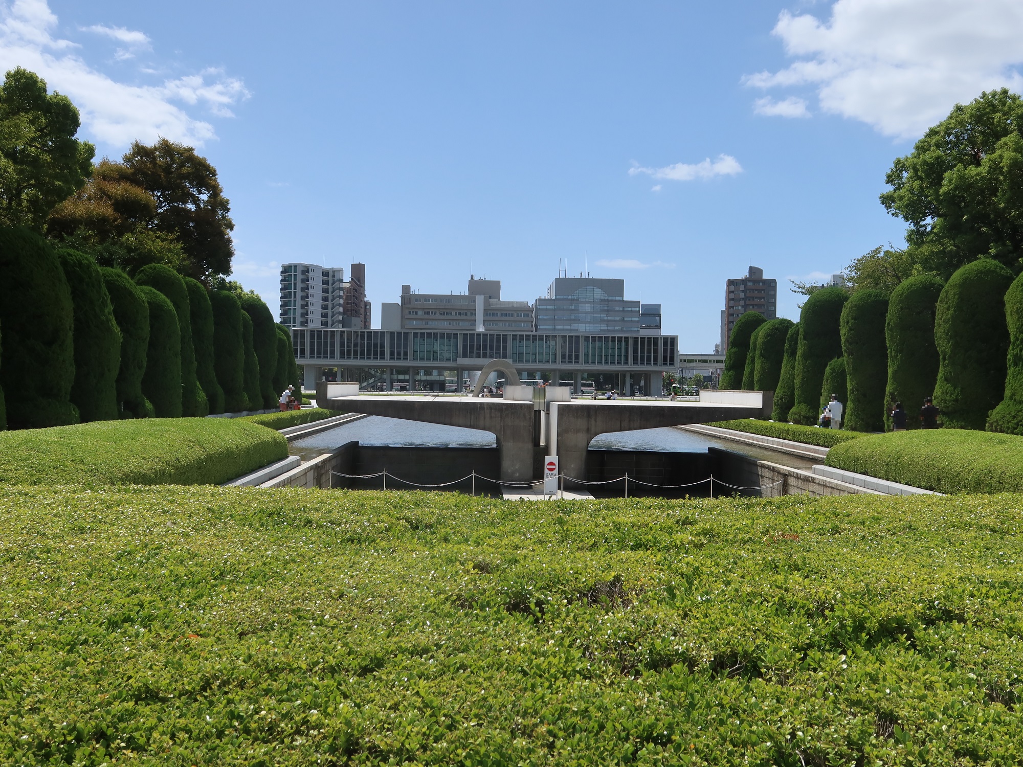 広島の観光名所の一つ、平和記念公園です。旧太田川と元安川が分岐するあたりにある公園で、元安川の対岸には原爆ドームがあります。