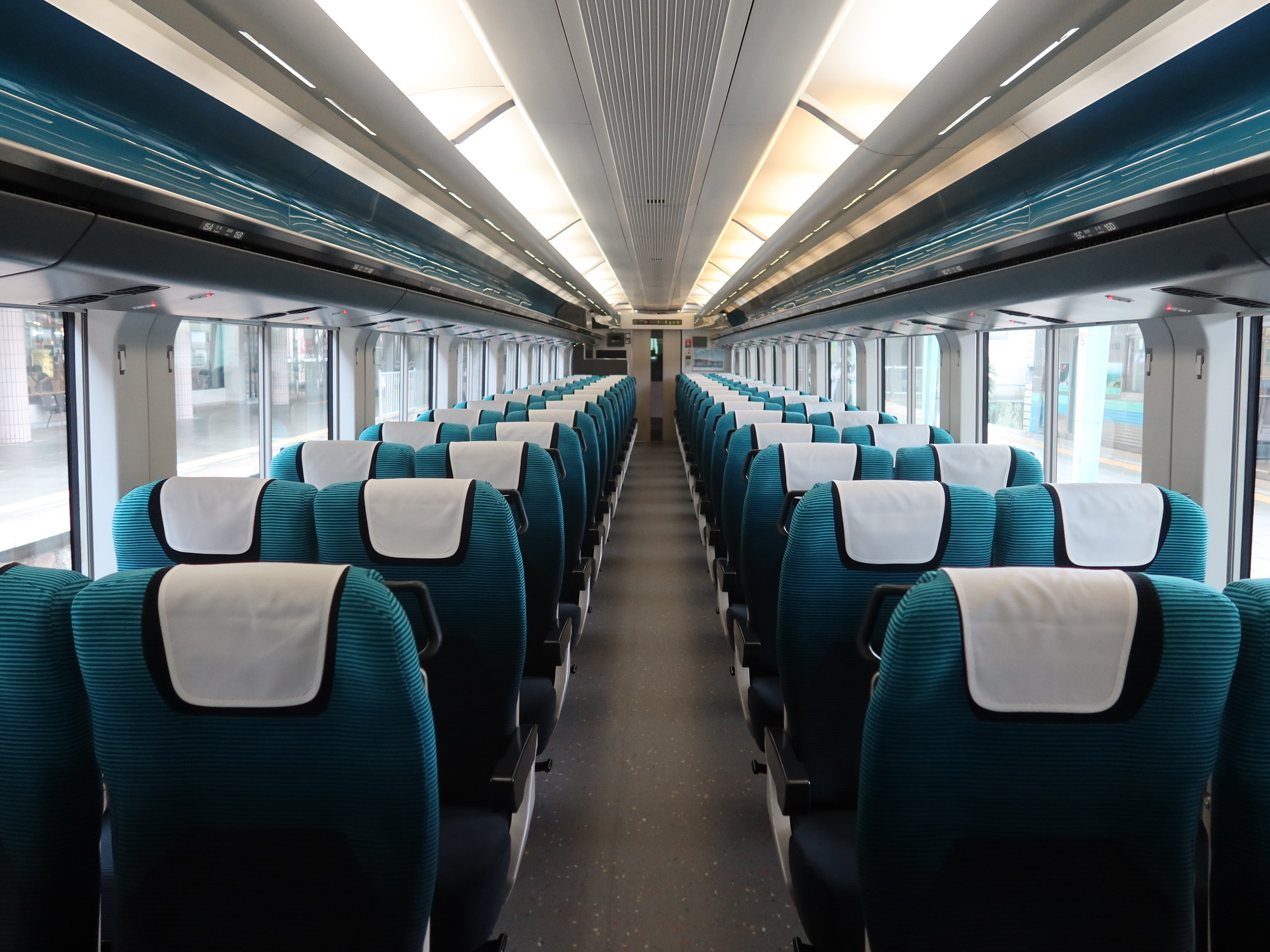 普通車の車内は、エメラルドブルーで統一されています。