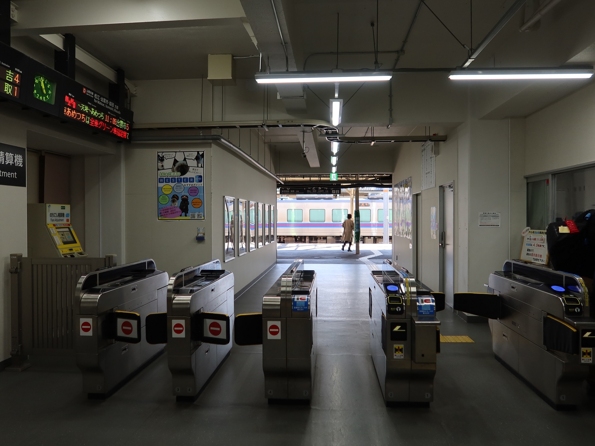 仮設の改札口です。ICOCA・Suica・PASMOなどの交通系ICカード(以下、Suicaと略します)対応の自動改札機が並びます。ちなみに、Suicaは鳥取駅では使えません。