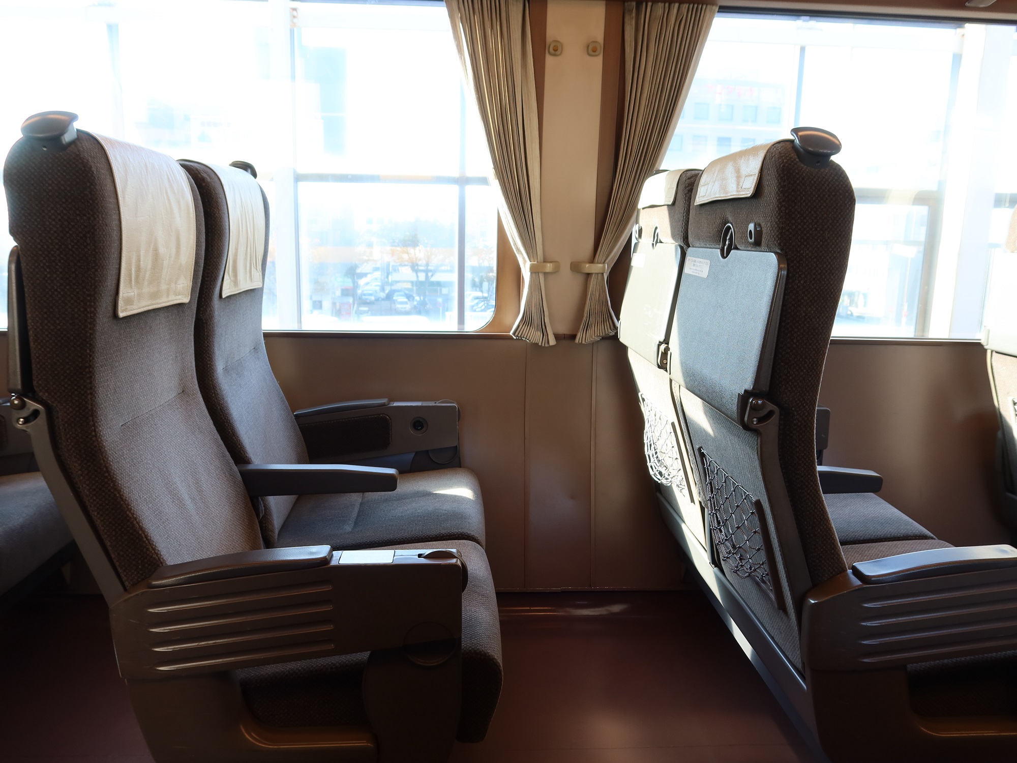 シート背面です。シート背面テーブルとコートフック、網状の物入れがあります。残念ながら、ACコンセントは付いていません。ま、ディーゼルカーなので仕方がないとは思います。