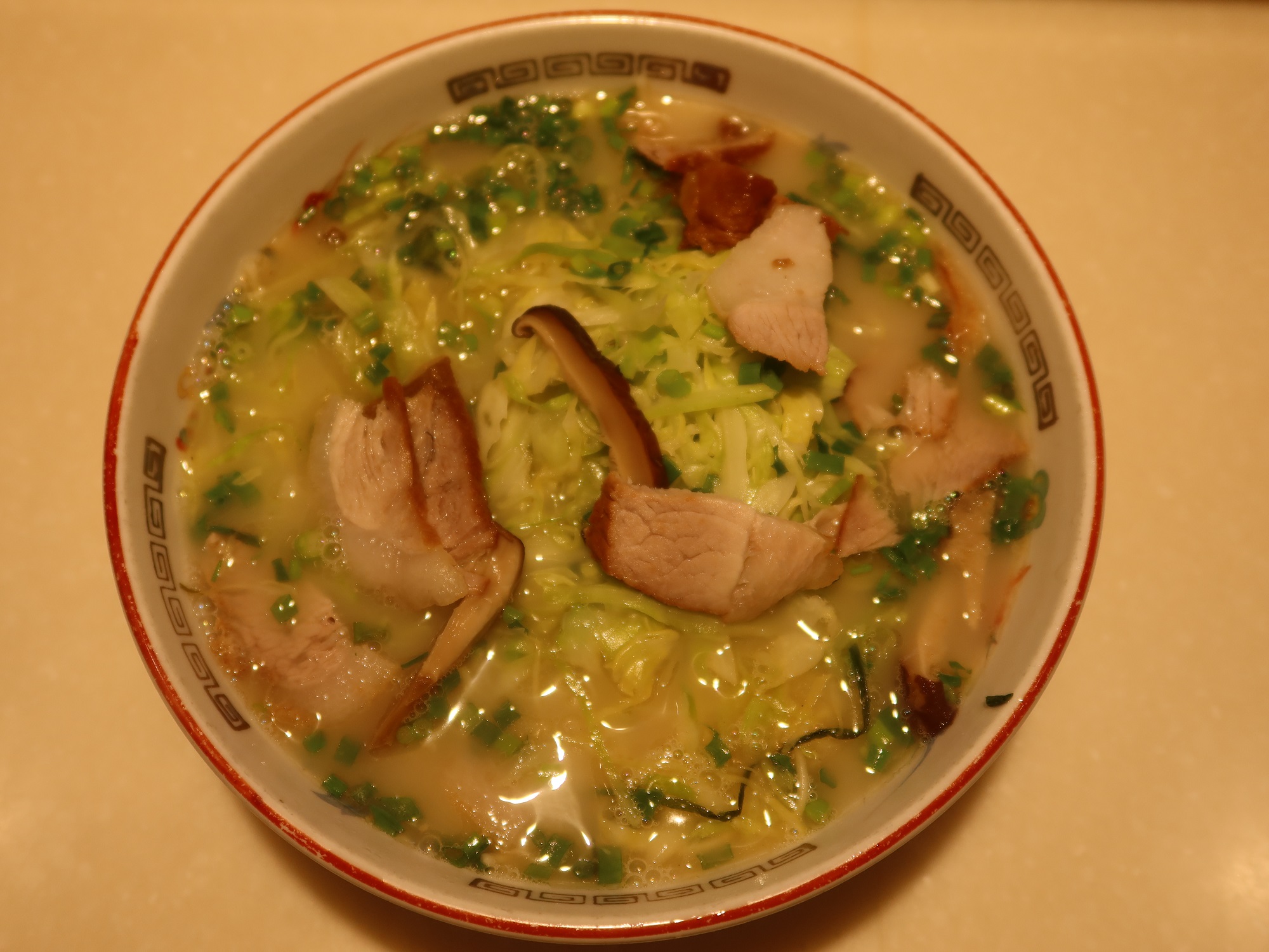 九州のラーメンらしく、スープは豚骨スープ。ただし、意外とあっさりしていて、口当たりがいいです。麺は細麺・・・ではあるのですが、九州ラーメンにしては太めです。