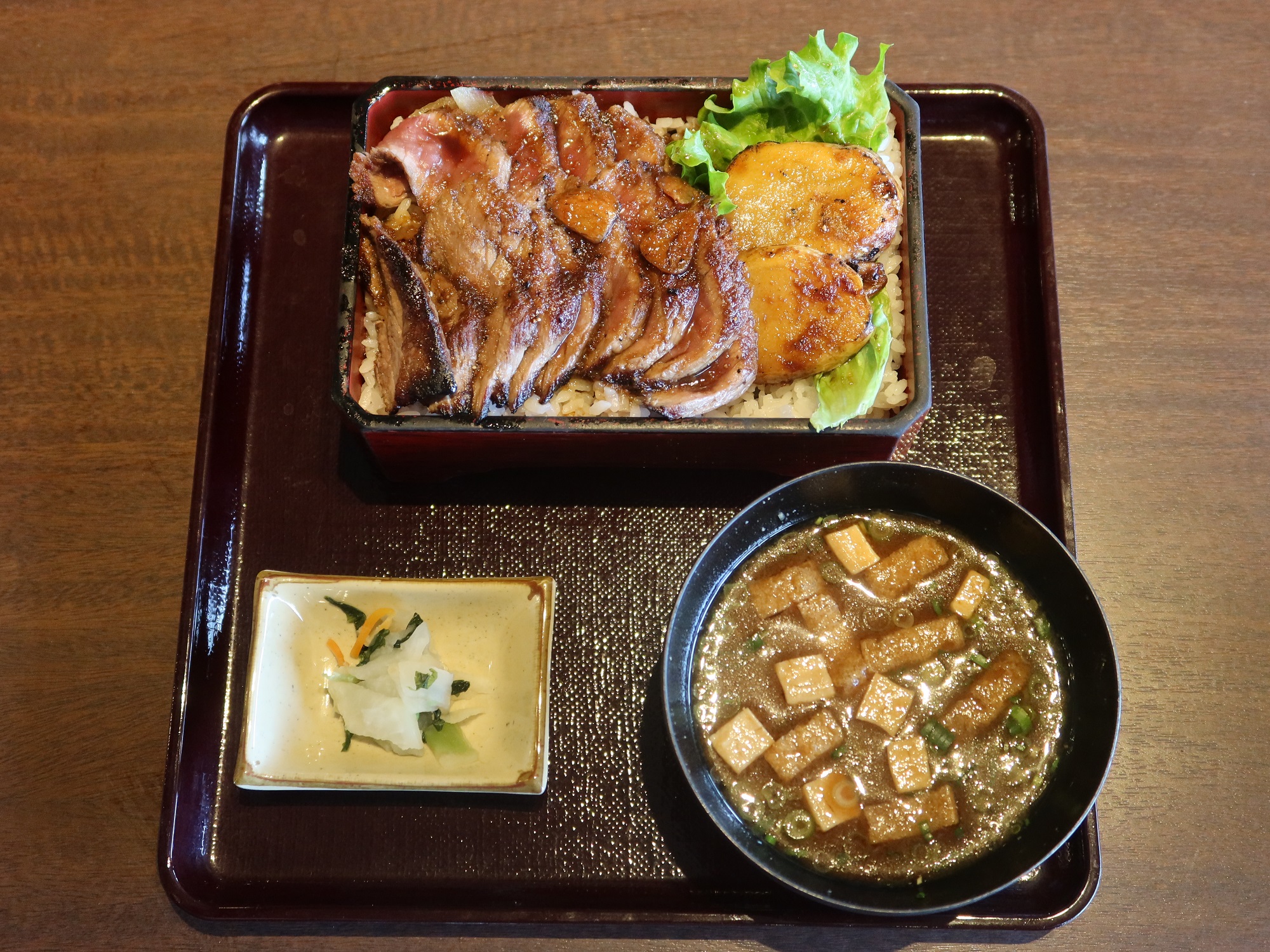 ステーキ重の部分をアップにすると、こんな感じ。ご飯の上に、スライスした牛ステーキと焼きポテトが乗っていて、しょうゆベースのたれがかかった状態で出てきます。ご飯の量と比較すると、お肉の量は多め。なのでお肉が食べたかったキューティー吉本としては満足のいくステーキ丼でした。