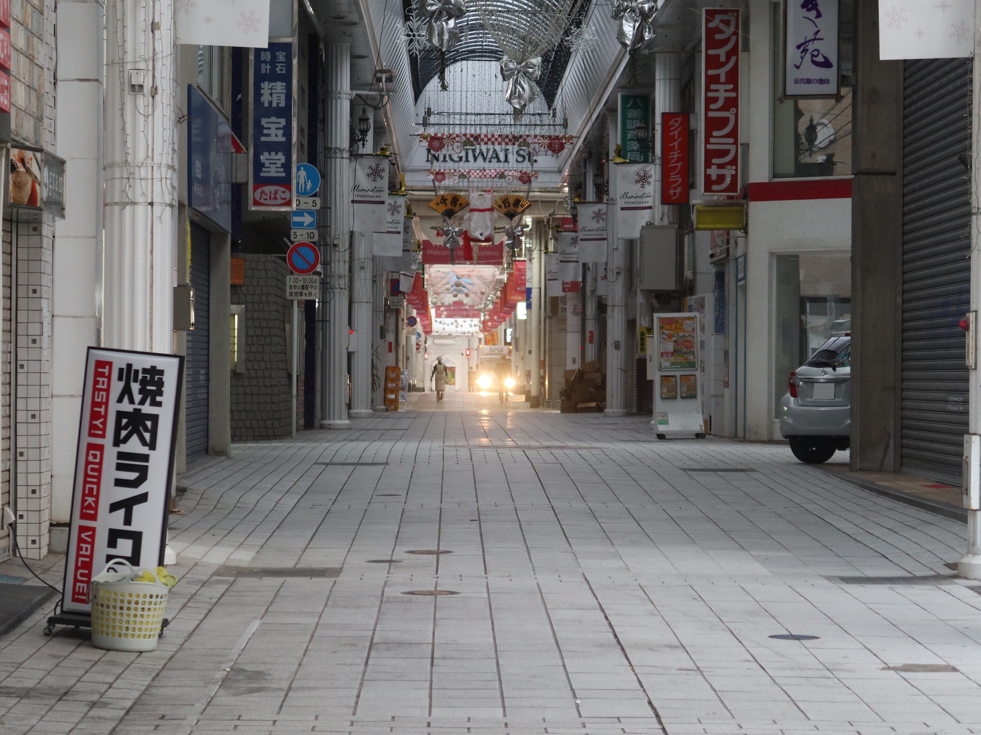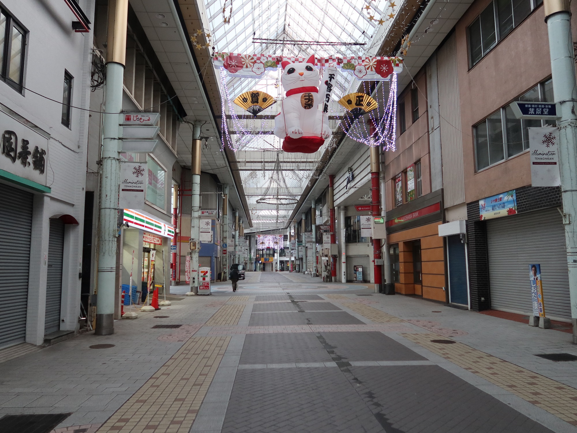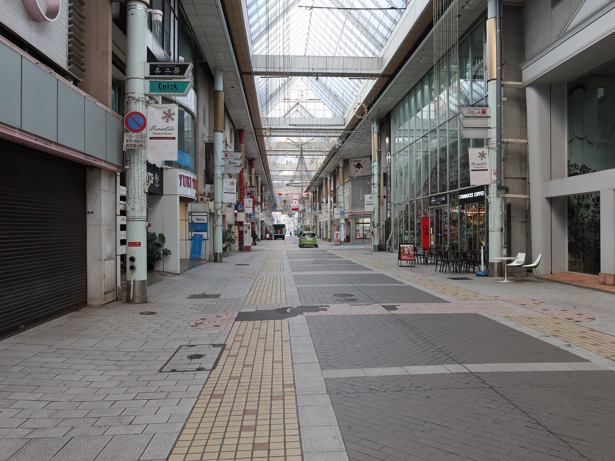 注:人通りが少ない、朝の時間帯に撮影しました。このため、ほとんどのお店のシャッターが閉まっています。