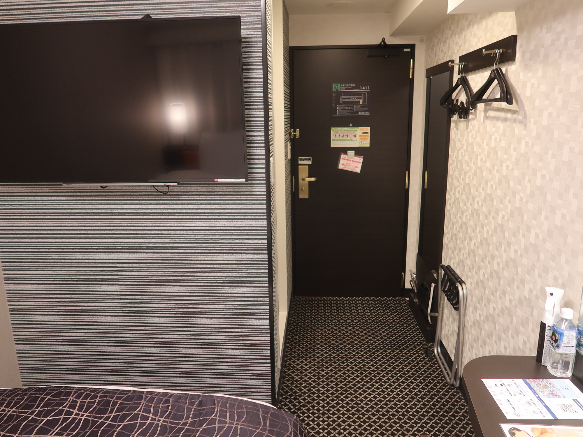 先ほどと逆方向を見ると、こんな感じ。ベッドの壁の間は余裕があるので、ここに荷物を置けます。また、最近のアパホテルは必要以上に大きい液晶テレビが置いてあるのですが、ここも同じ感じです。この位置だと、ベッドに寝っ転がると首を上げないと見えず、デスクからだと後ろを振り返らないと見えないのが問題点ですね。