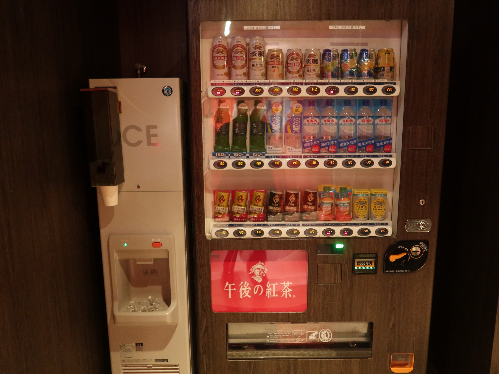 1階にはフロントと自動販売機、電子レンジがあります。2階には自動販売機と製氷機があります。2階の自動販売機には、アルコール類の販売もあります。