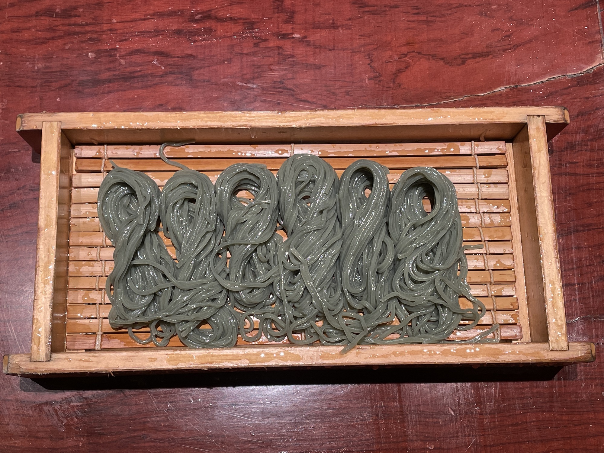 最後の〆に、へぎそばを注文。へぎそばは新潟県の食べ物なのに、なんで名古屋で・・・と思いつつも注文しました。で、キューティー吉本が新潟で食べたときよりも青みの強いお蕎麦が出てきました。でも、うまかったですよ。1人前だと一瞬でなくなりました。
