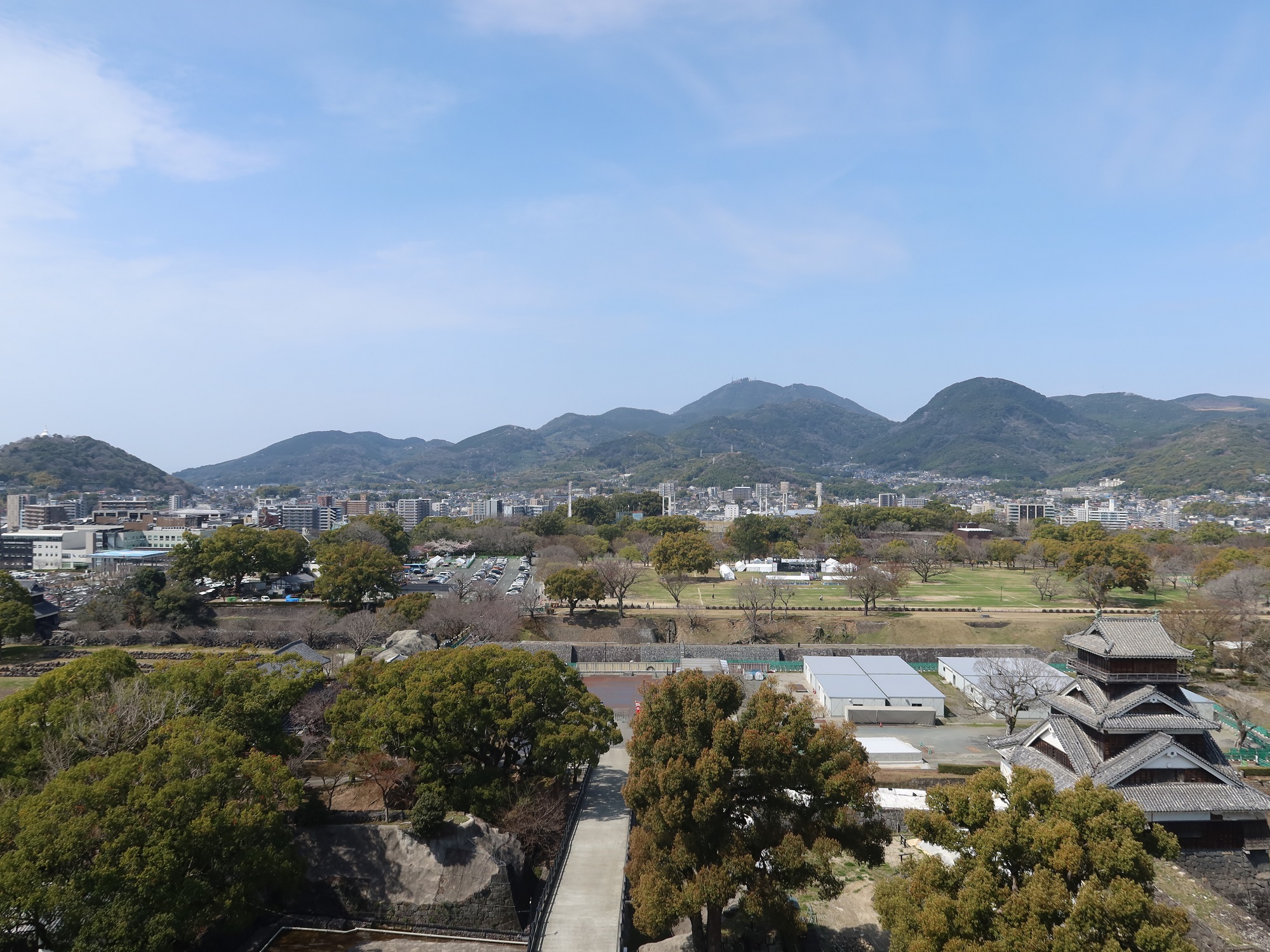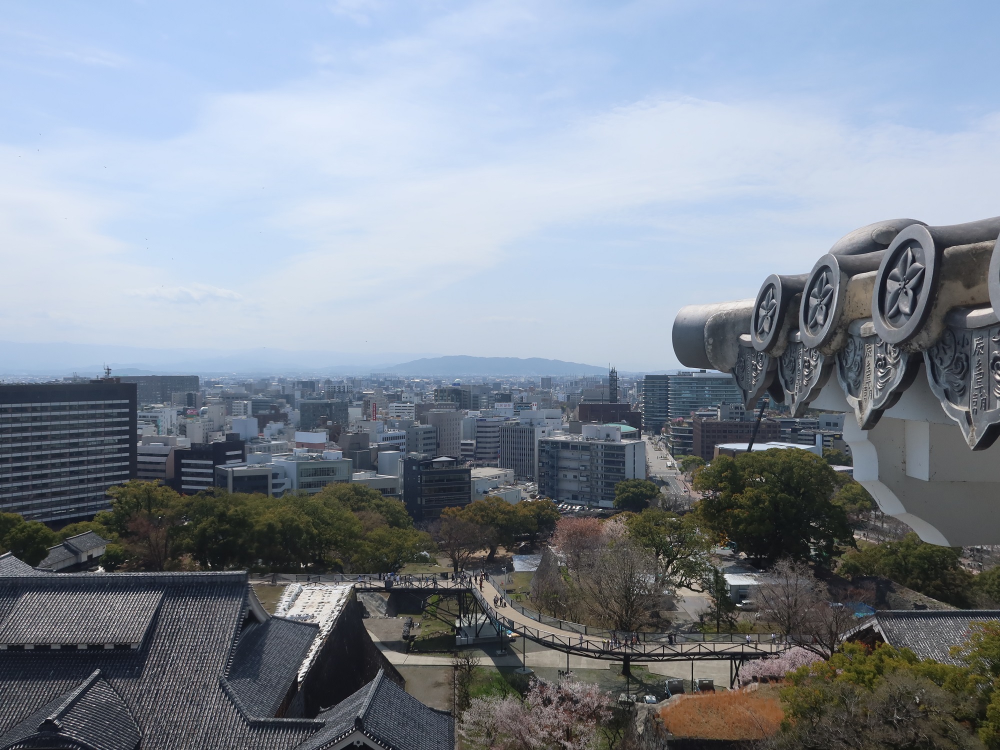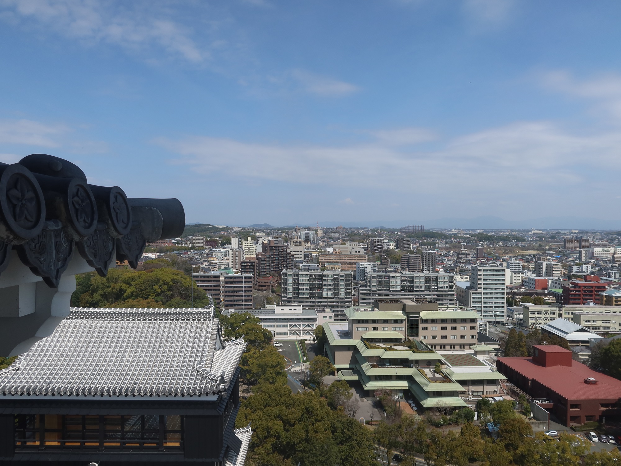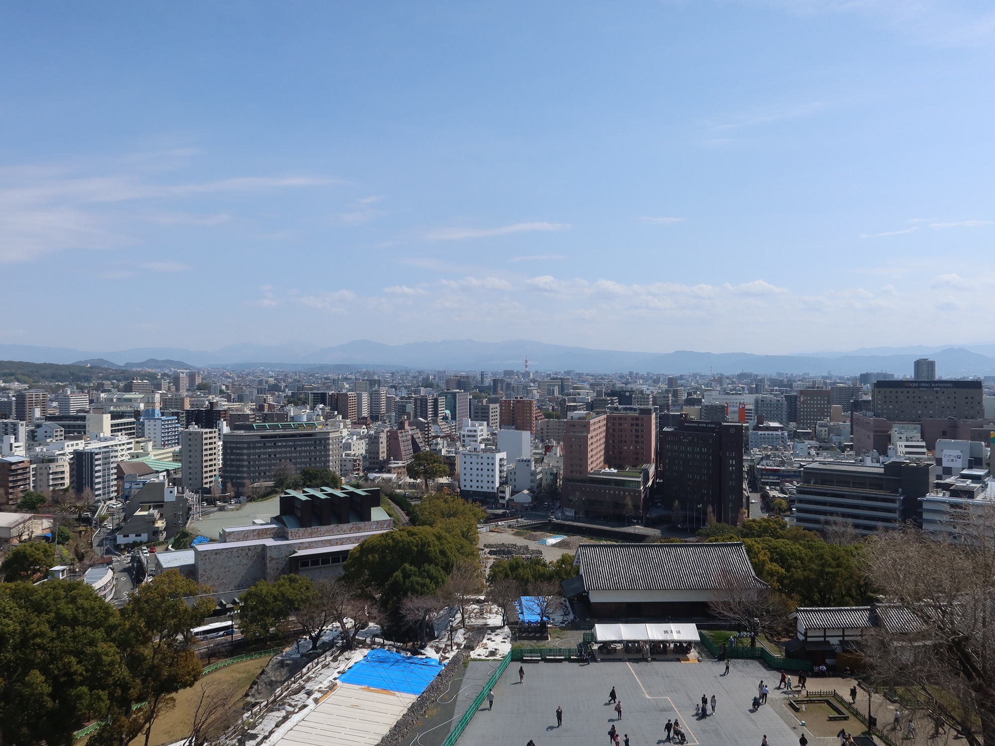 天守閣の中にあがることもできるようになっていました。こちらが、天守閣の上から東側を撮影した写真です。熊本市内の繁華街がある方向ですね。