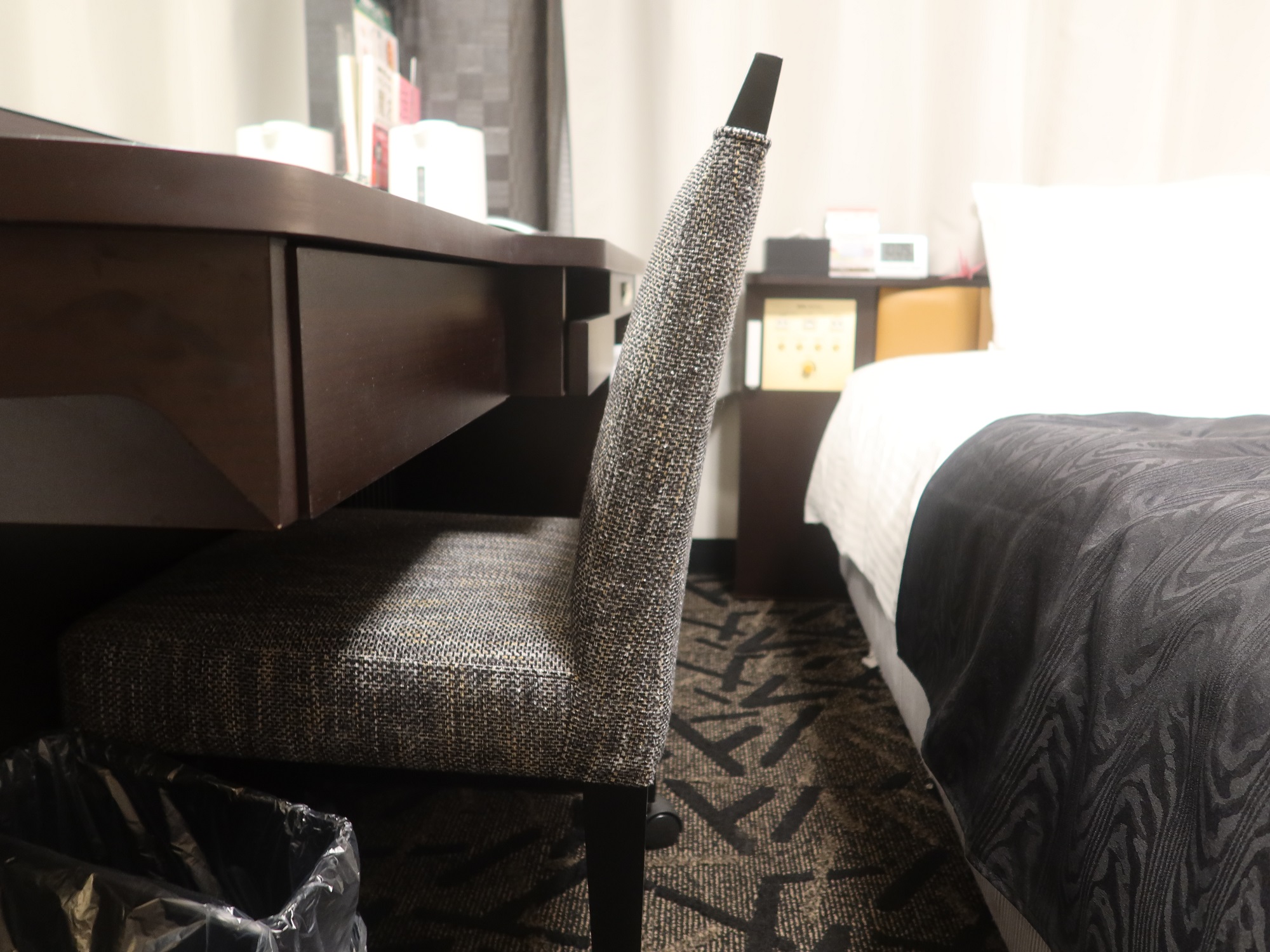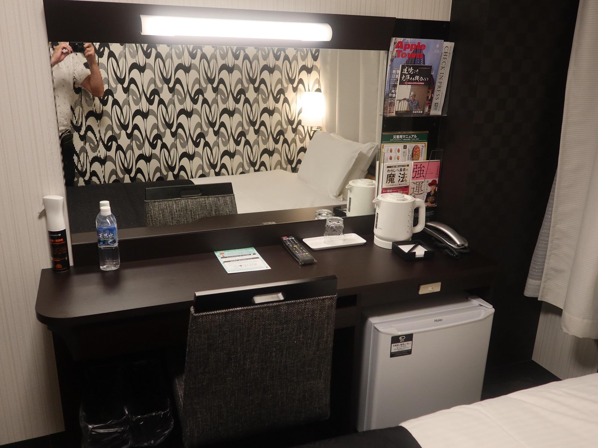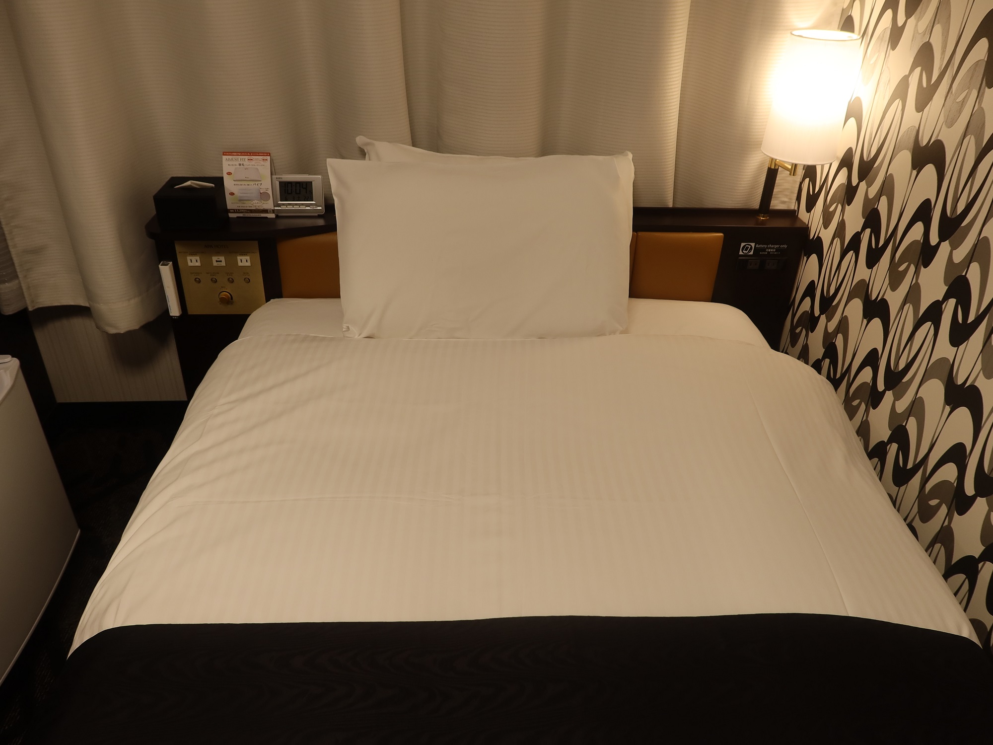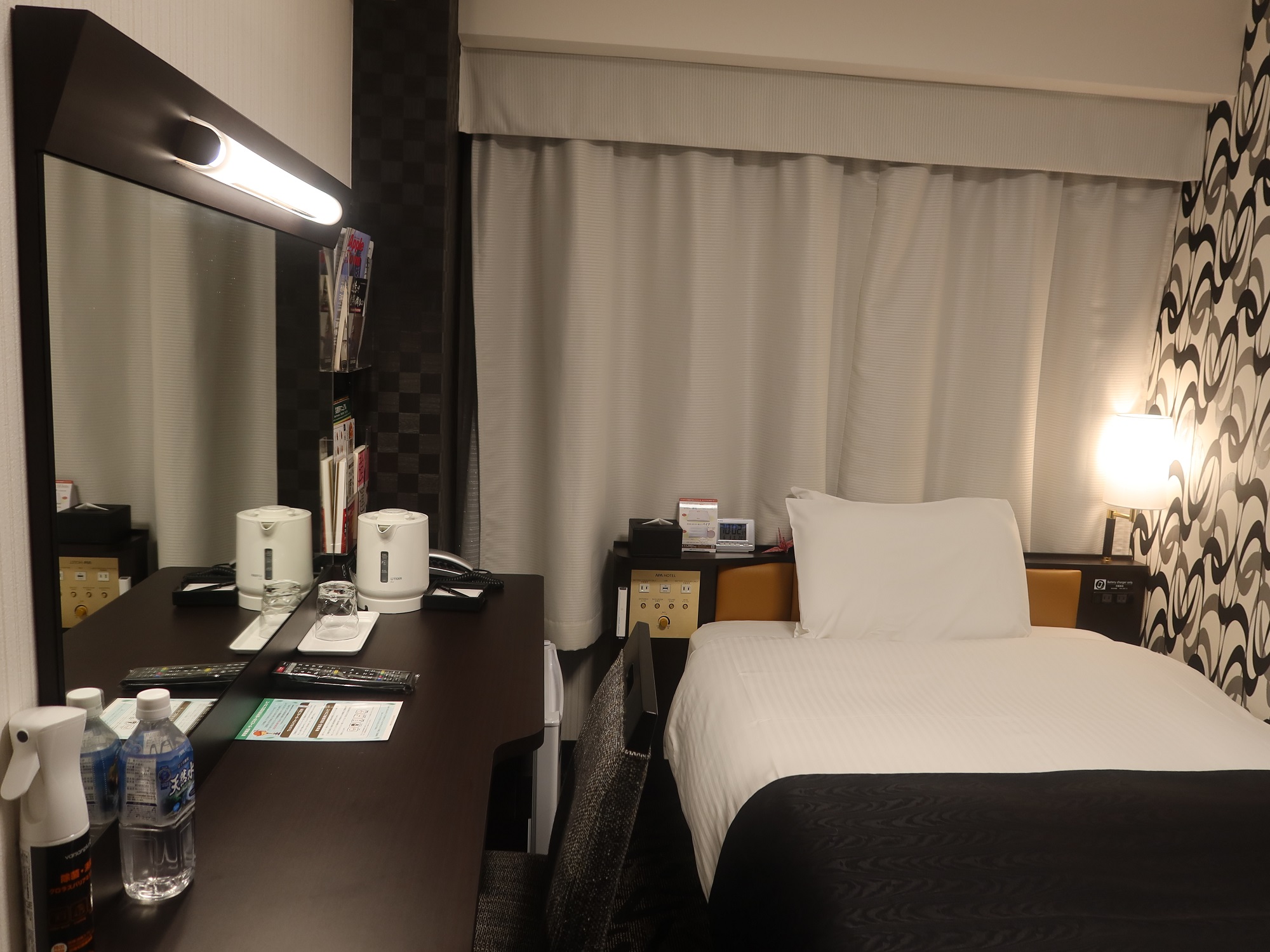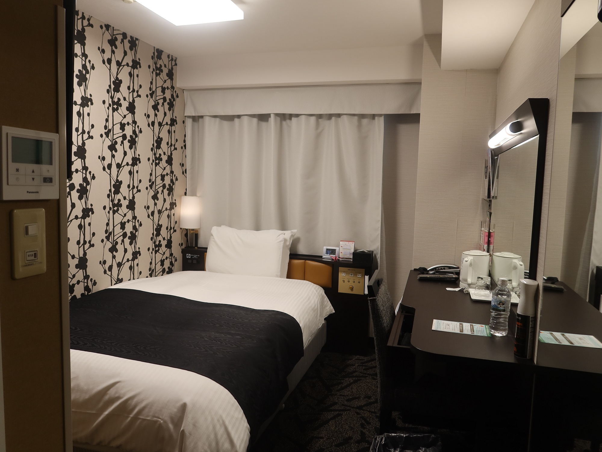 さすがアパホテルと言いますか、お部屋は狭いです。デスクでPC使って作業をしていても、椅子の背もたれがベッドに当たる感じです。