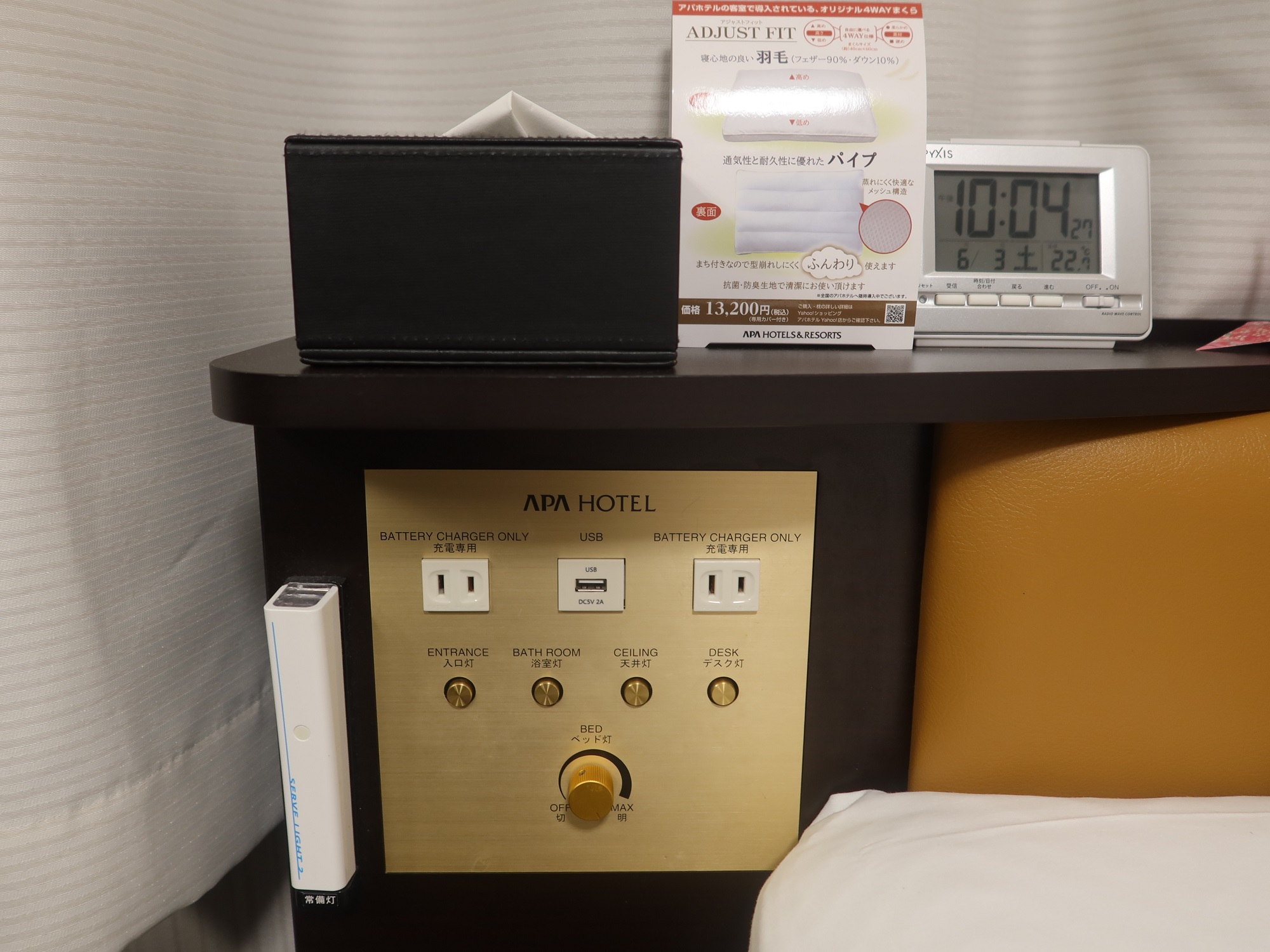 枕元には、明かりのスイッチとACコンセント、USBポート、ティッシュ、目覚まし時計があります。