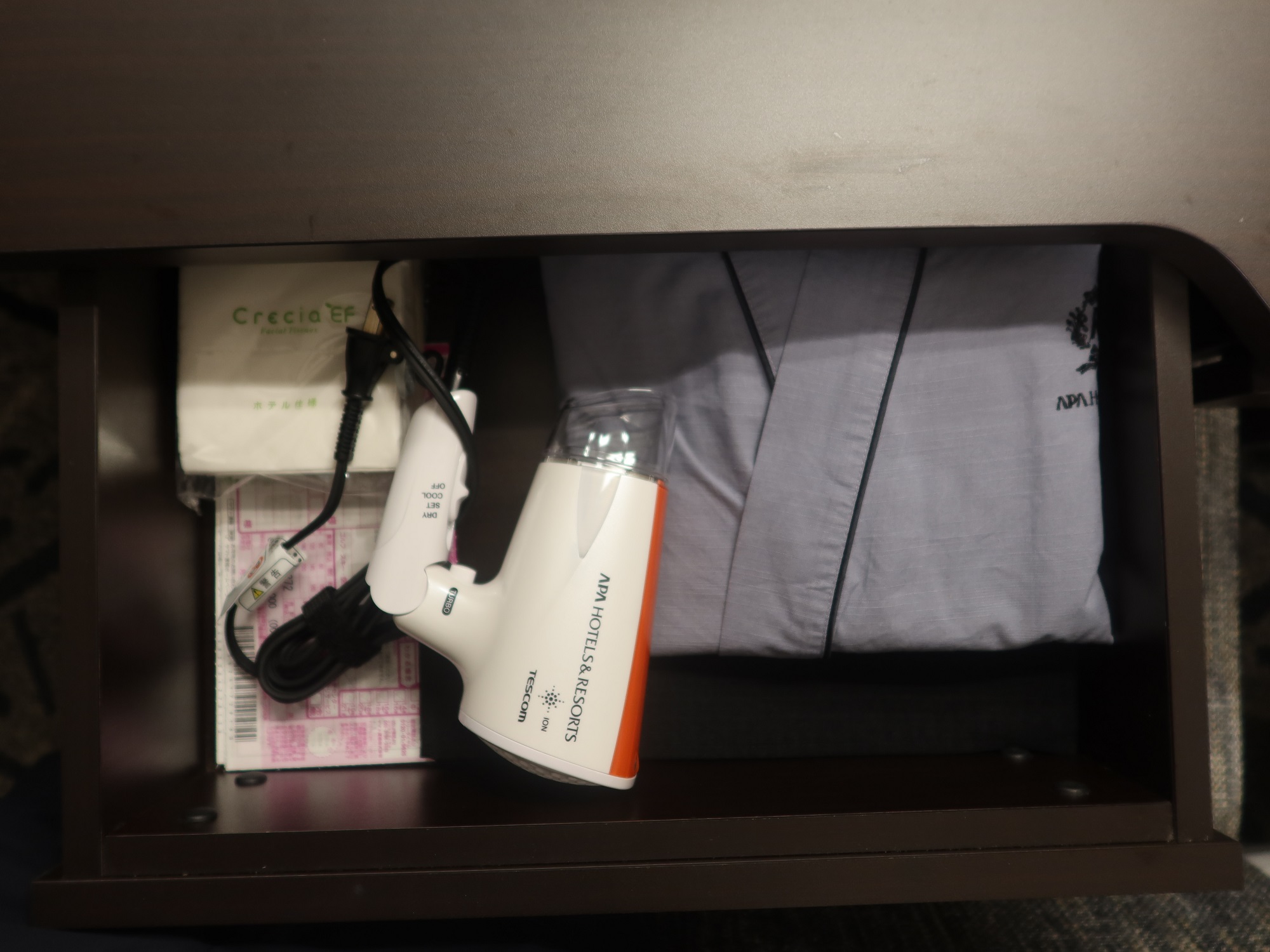 引き出しの中には、部屋着とドライヤー、宅急便伝票が入っています。