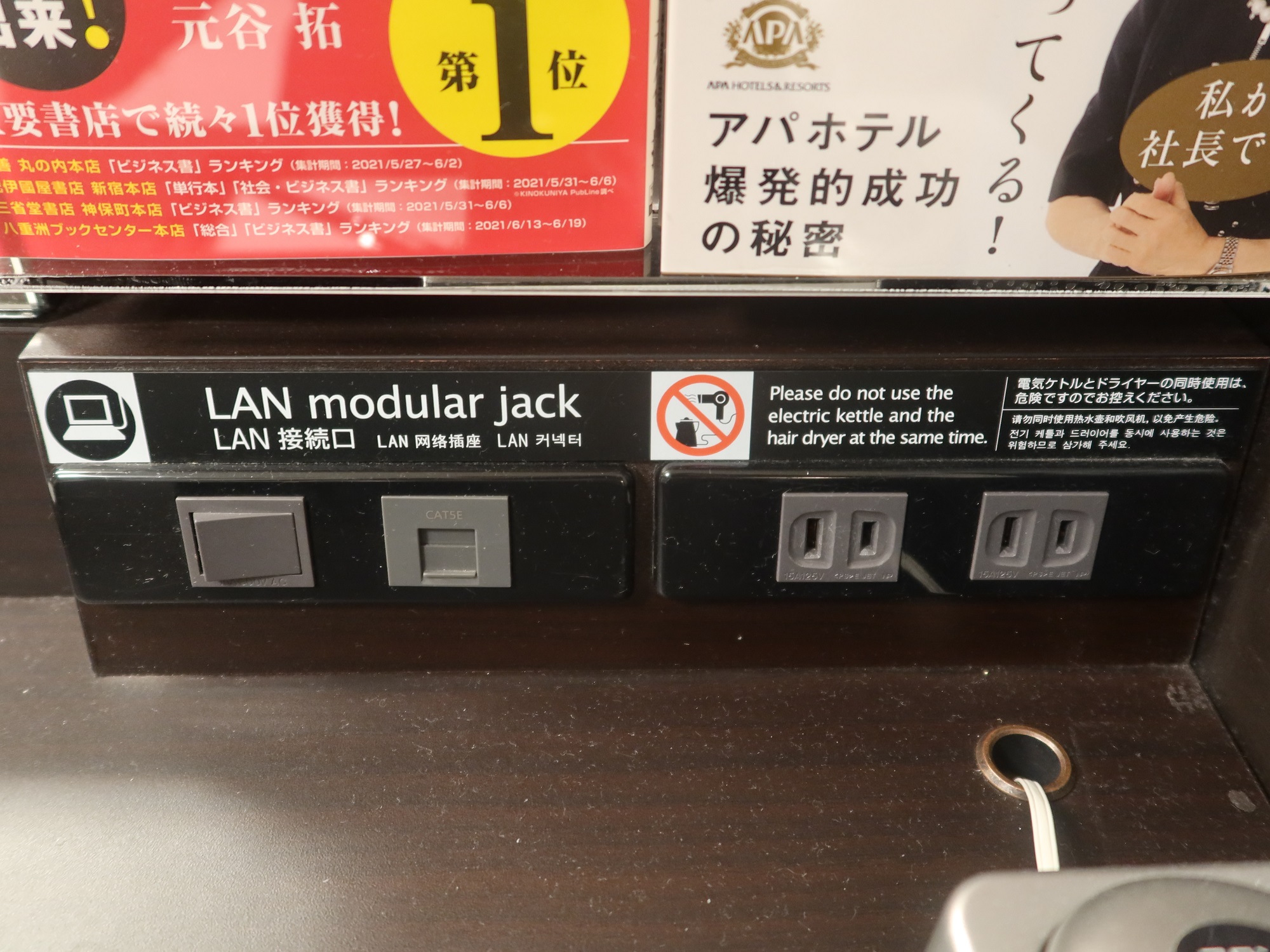 問題点として、ACコンセントがデスクの端にあるため、ACアダプターのケーブルが短いと届きません。できればテーブルタップを持って行ったほうがいいと思います。(もっとも、近くにヨドバシカメラがあるので、いざとなればヨドバシカメラで買うという手もあります)