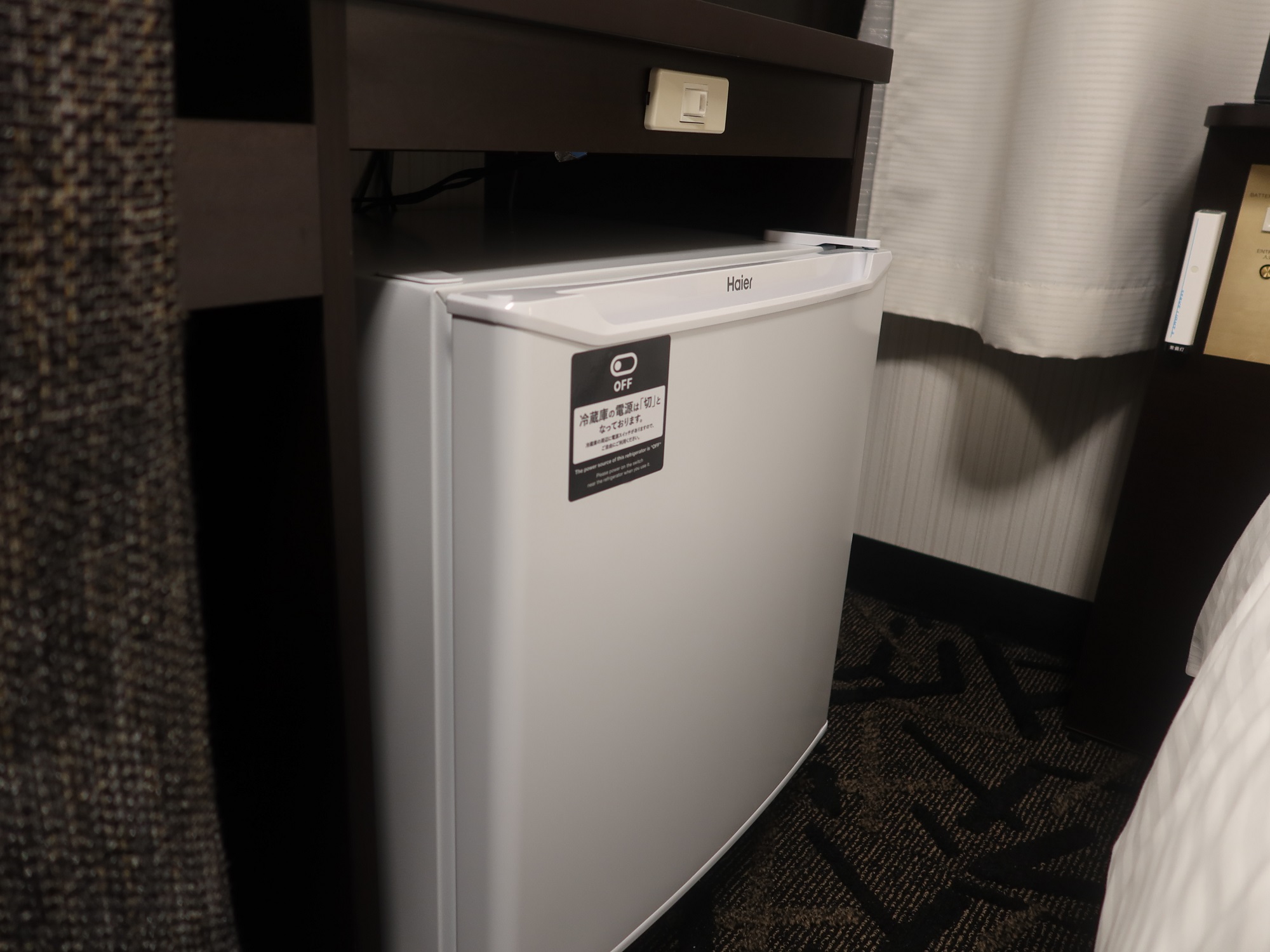 冷蔵庫はデスク下にあります。スイッチを切ることもできます。