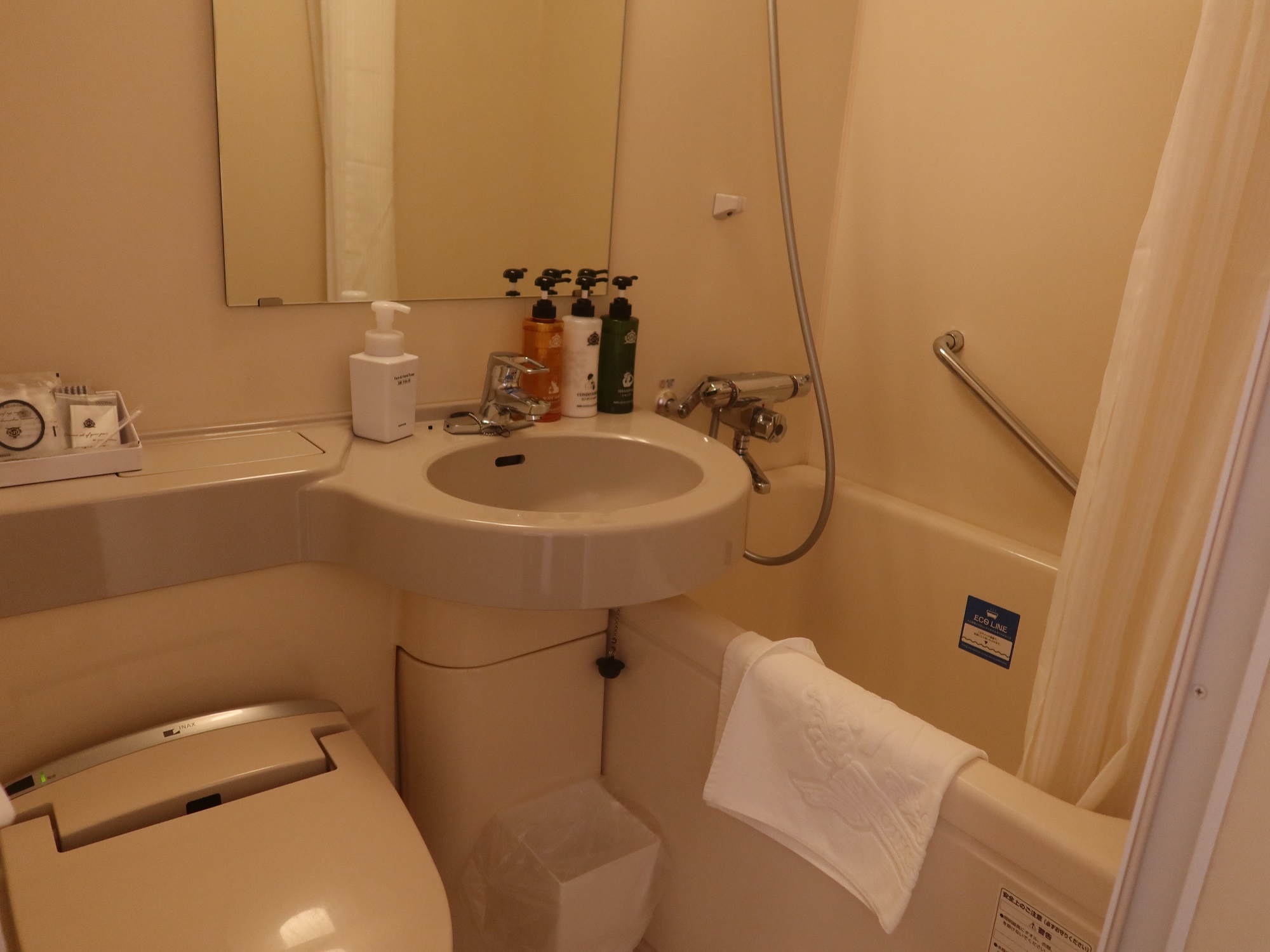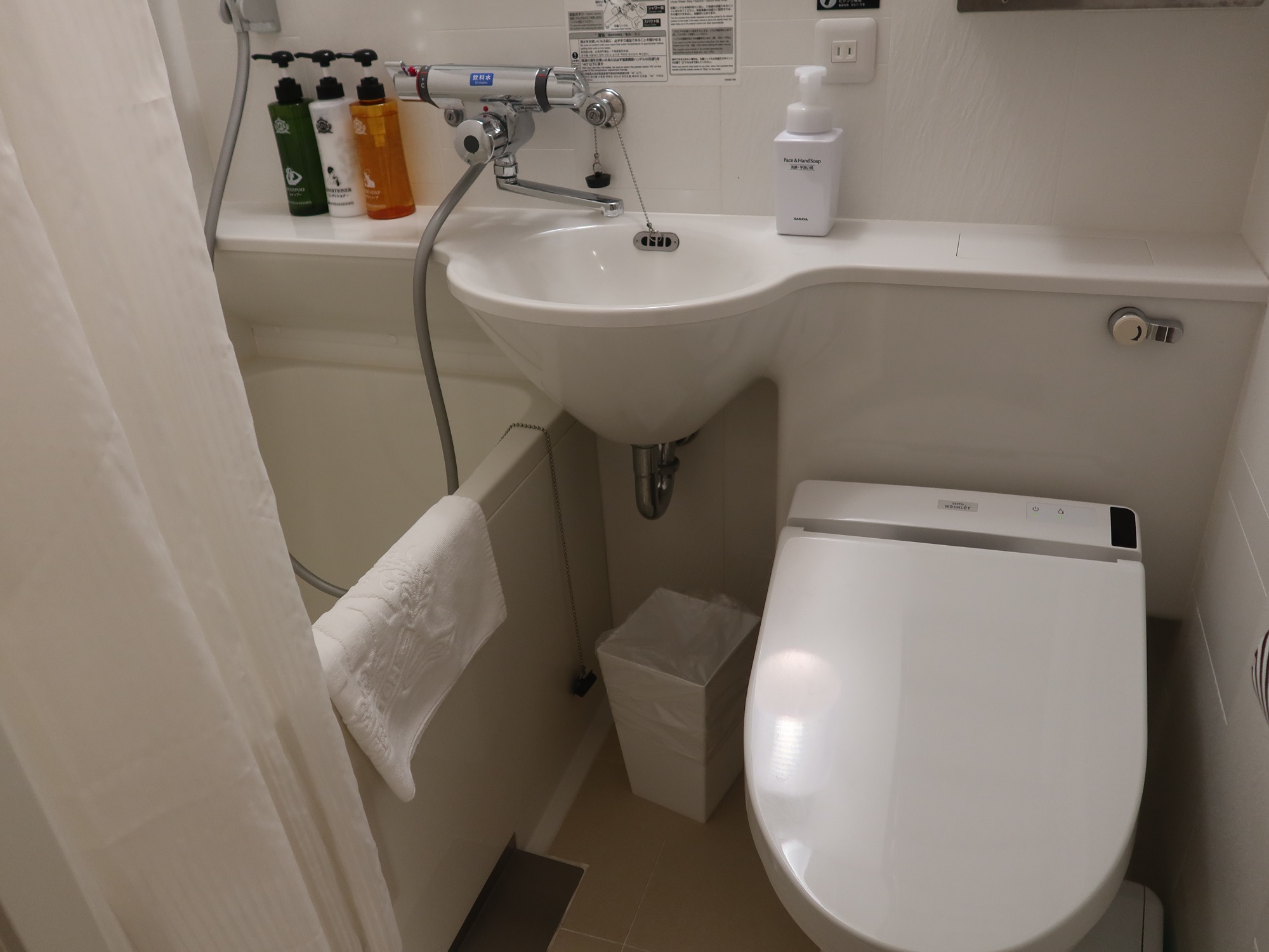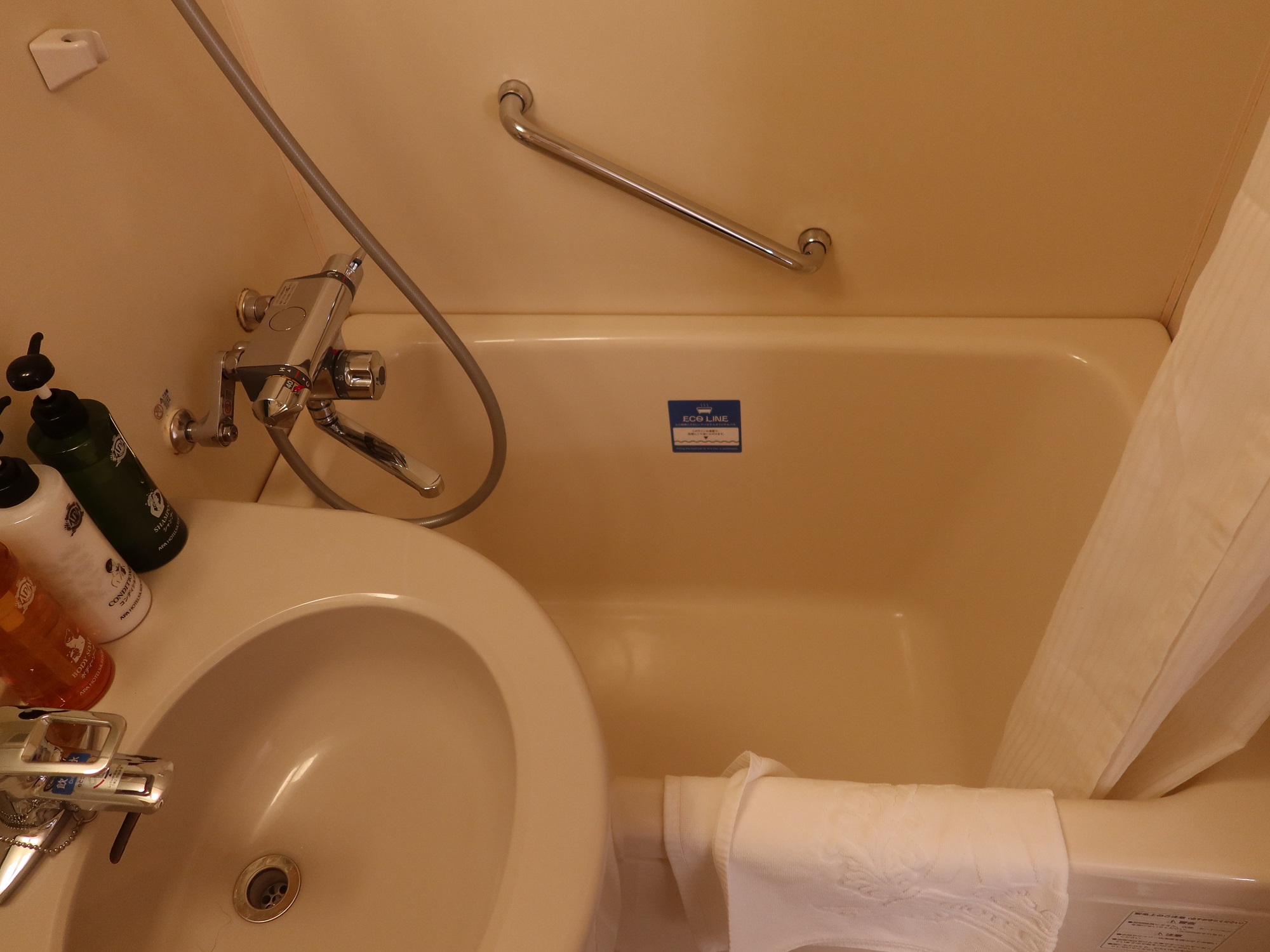 バスタブです。近年建てられたアパホテルは卵型のバスタブなのですが、ここは普通のバスタブです。ただし、自動水栓に交換されていまして、一定量で自動的に止まる仕組みになっています。
