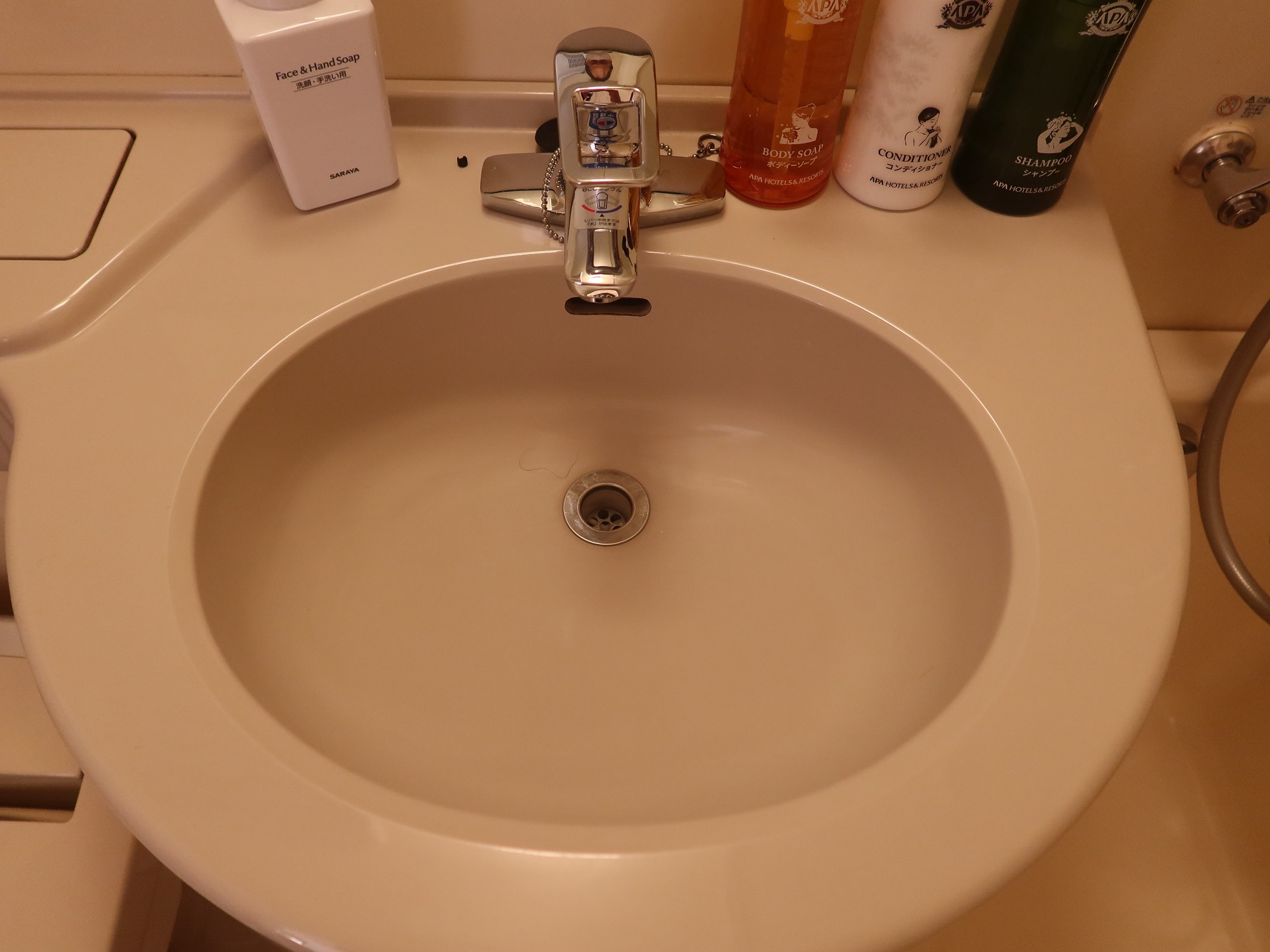 洗面台です。ここも水栓がシングルレバーのものに交換されています。近年建てられたアパホテルは洗面台が狭いのですが、ここは必要にして十分な広さがあります。