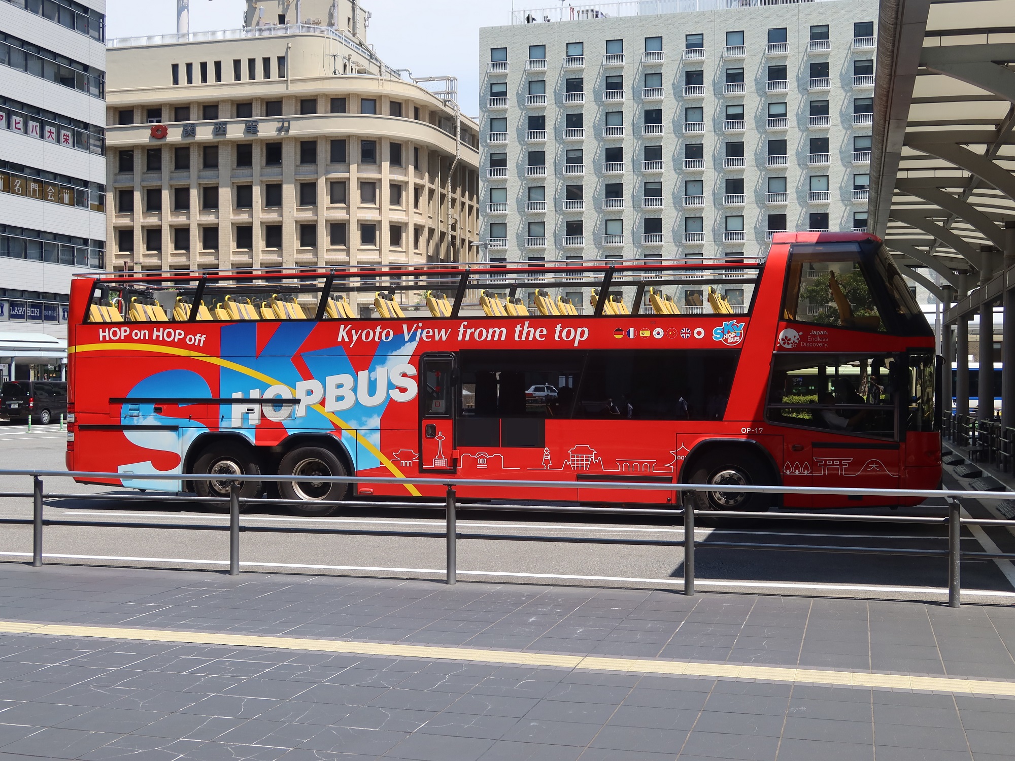 オープントップバスです。京都駅の定期観光バス乗り場に止まっていました。