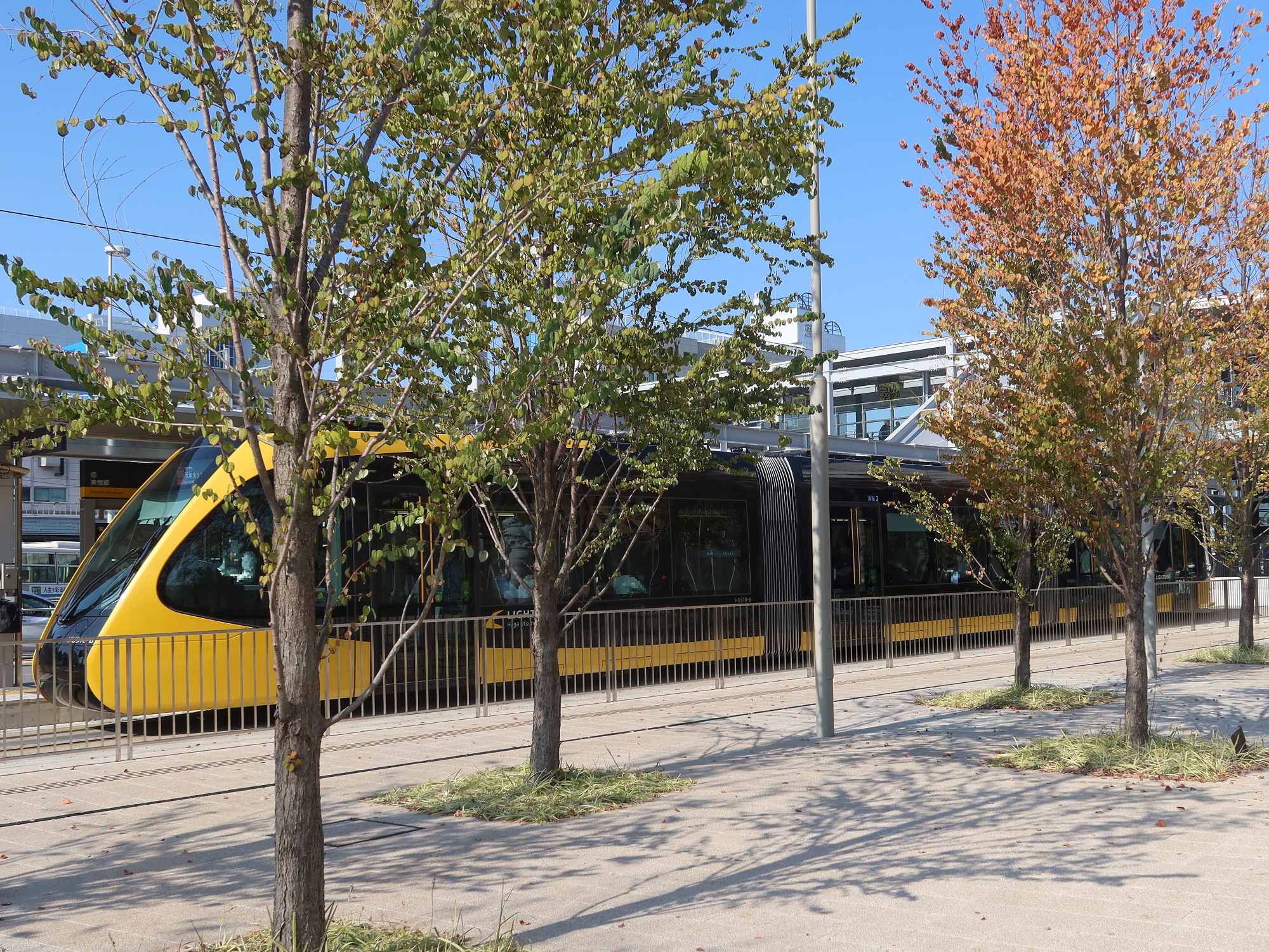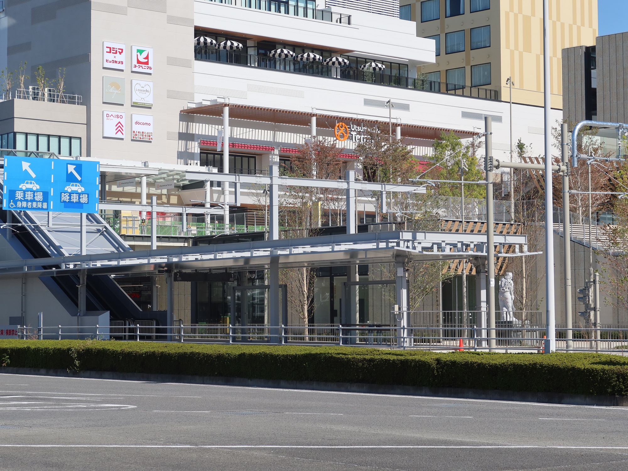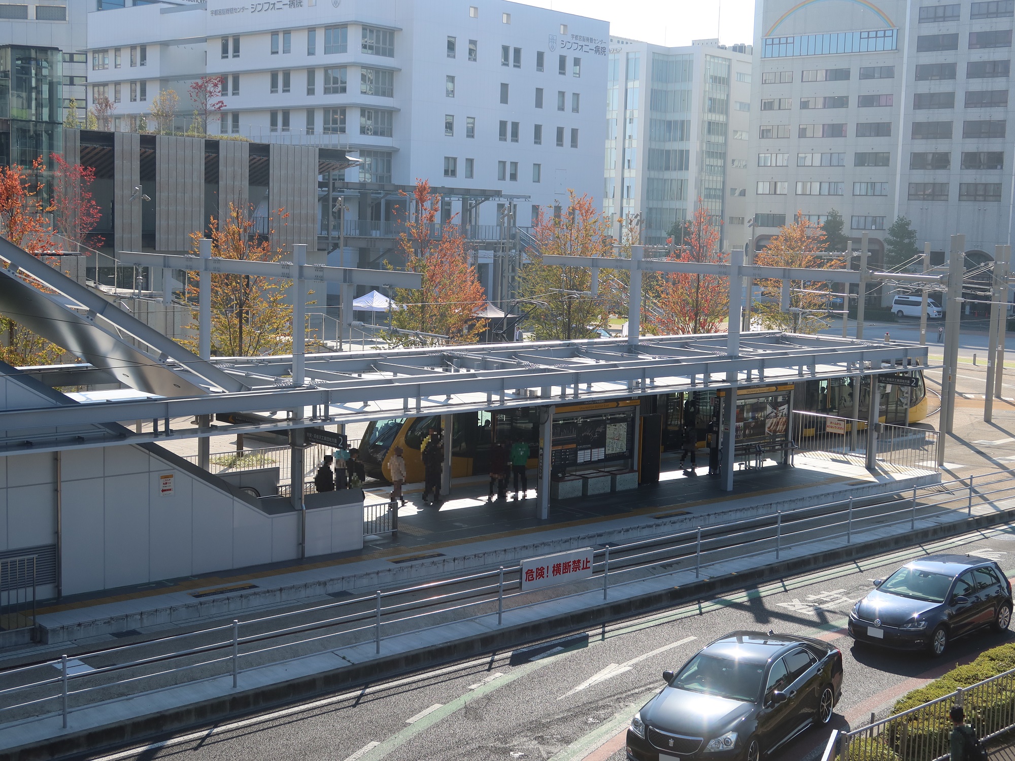 先ほどの電車を、地上から見るとこんな感じです。周辺はライトキューブ宇都宮という商業施設のほか、オフィスビルやビジネスホテルが立ち並びます。