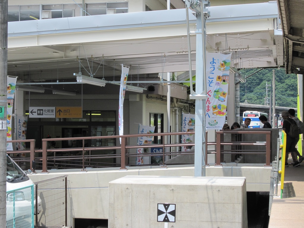 これが長野原草津口駅なんですけど、以前草津温泉に行ったときって、ホームから階段を上がって、写真左手にある駅舎の2階にある改札口に行っていたんです。で、改札口を抜けて、草津温泉行きのバスに乗るのに、また1階に降りていたんです。
