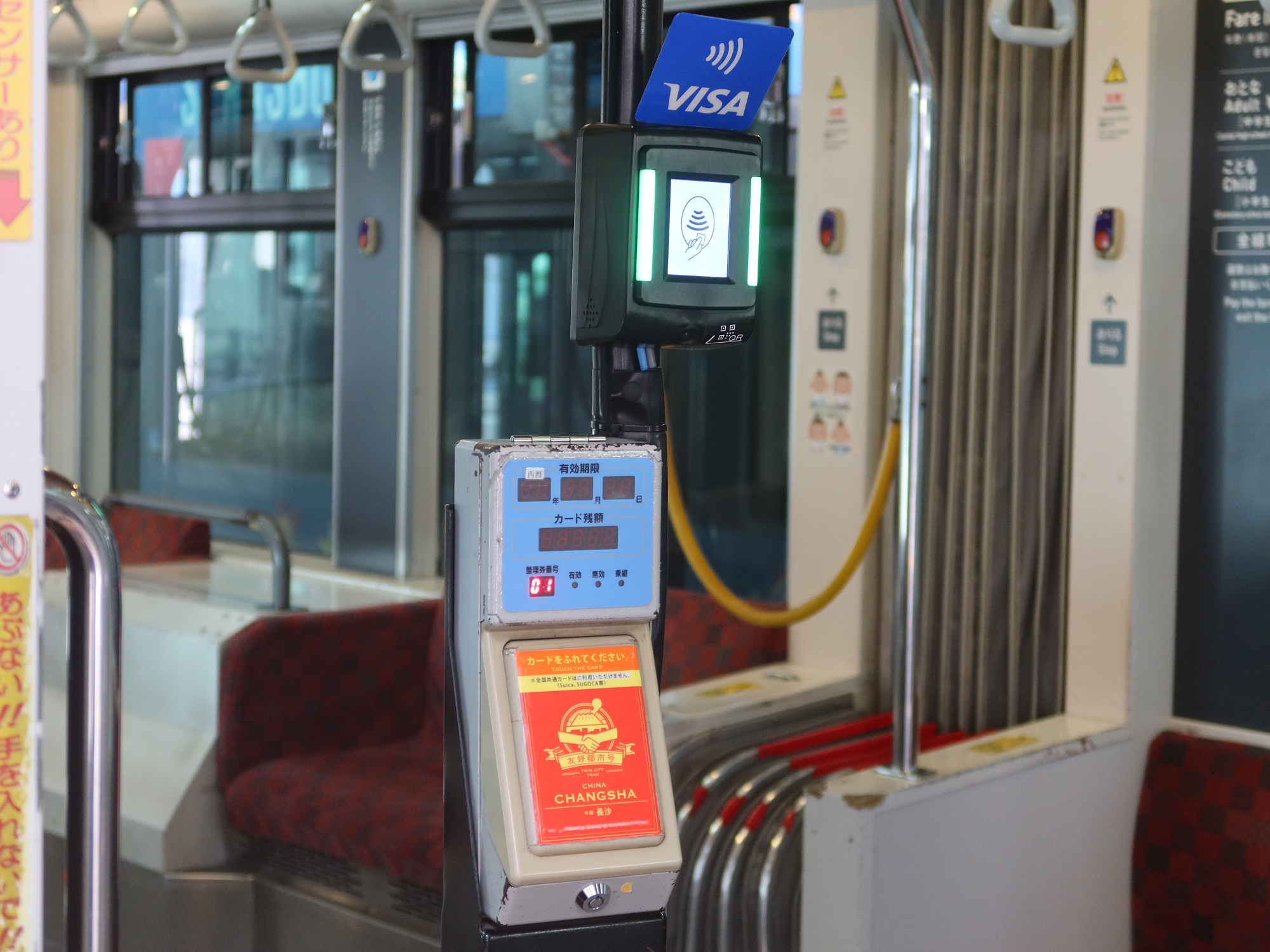 Visaのタッチ決済を利用するときは、乗るときにクレジットカードを、専用のカードリーダーにタッチします。鹿児島市電は均一料金なので、一体なぜ乗るときにタッチする必要があるのかは不明ですが、独自ICカードも乗るときにタッチする仕組みになっているので・・・
