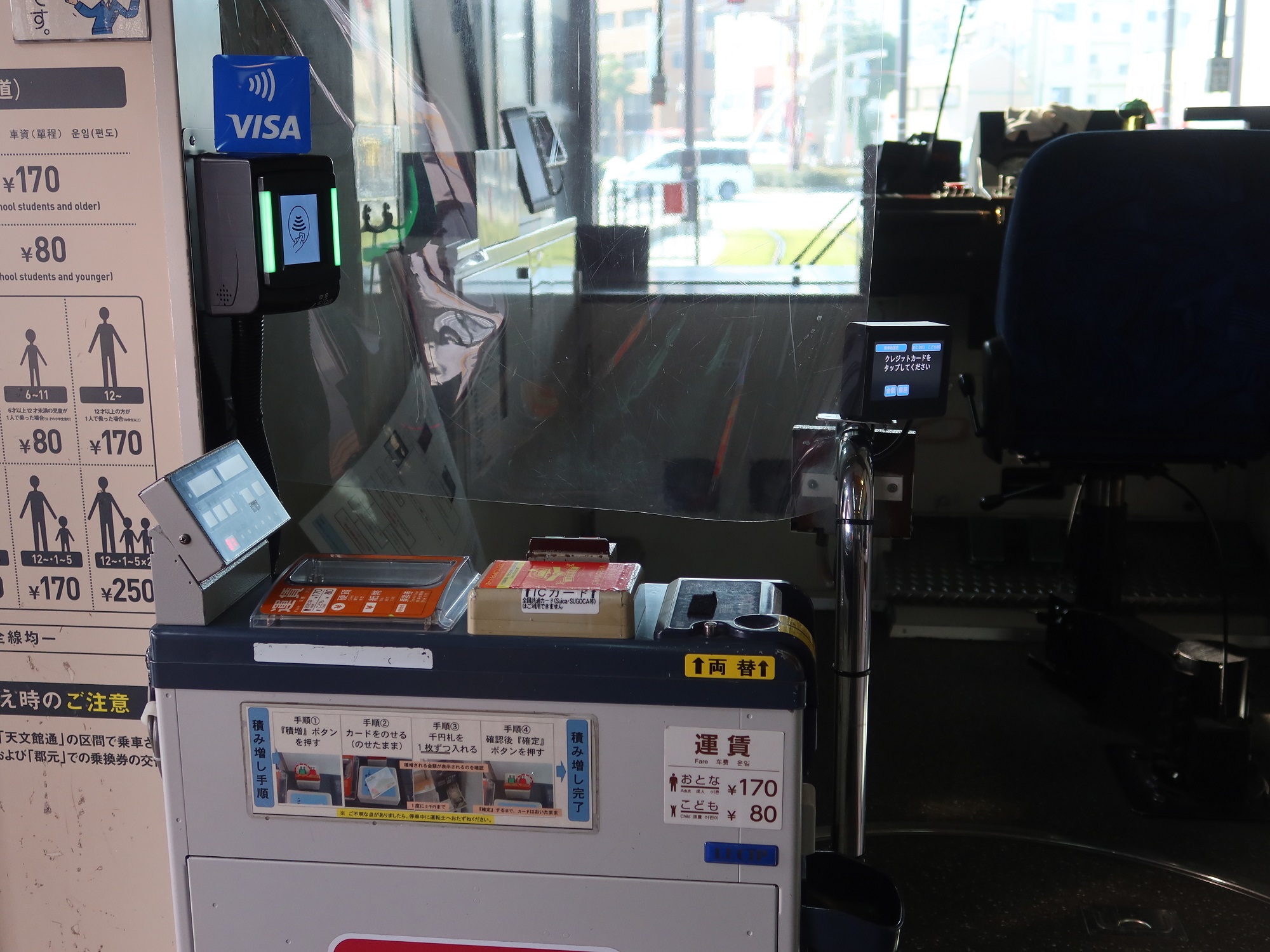 また、すべての車両でVisaのタッチ決済が使えるわけではなく、ICカードリーダーを搭載している車両のみです。ICカードリーダーを搭載している車両が来るかどうかは運次第で、結局は小銭を準備しておかないと行けないのはいただけない所ではあります。