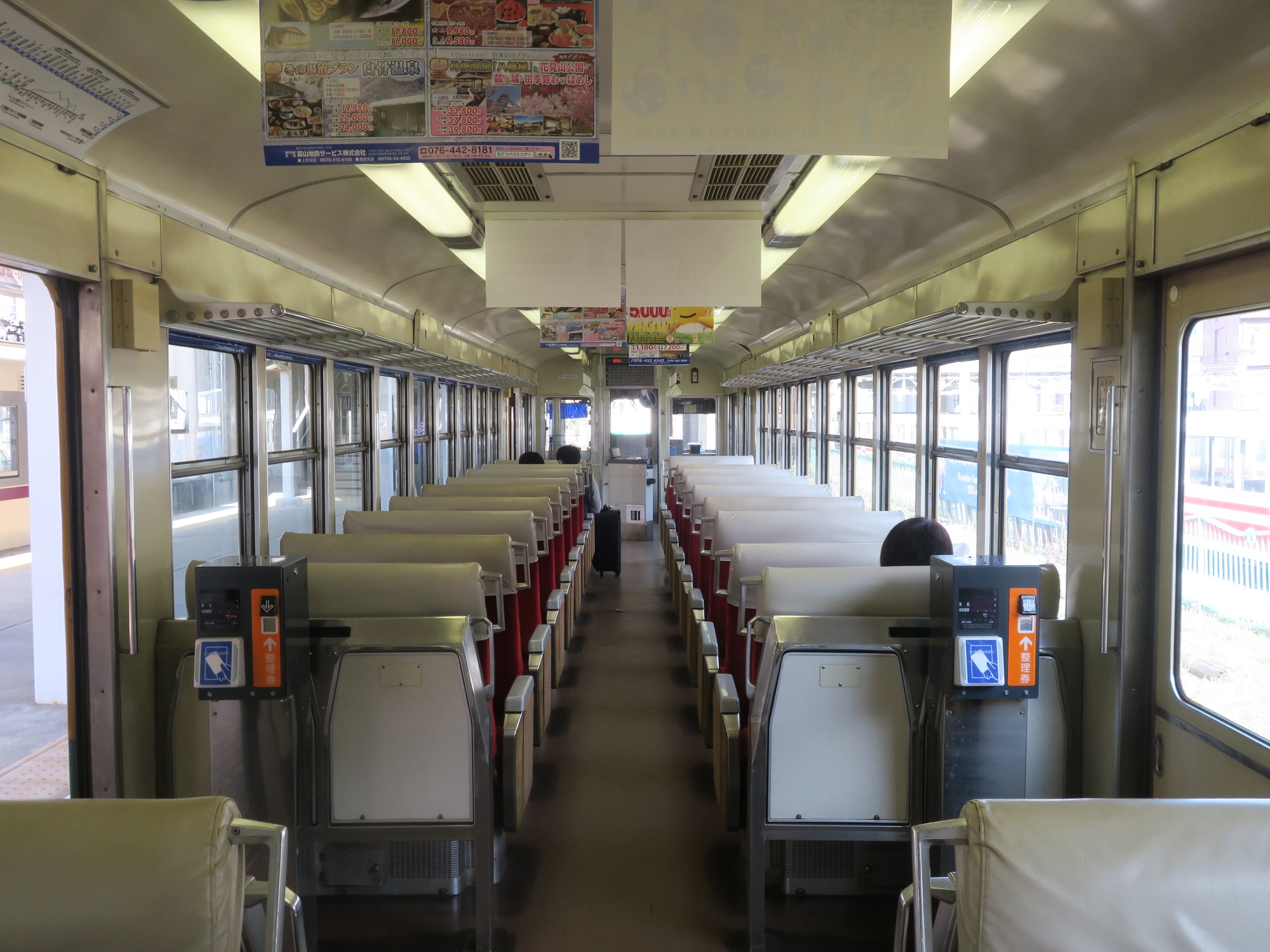 ちなみに、この写真は富山地方鉄道の電車です。扉の横に整理券発行機とICカードリーダーが置いてあります。