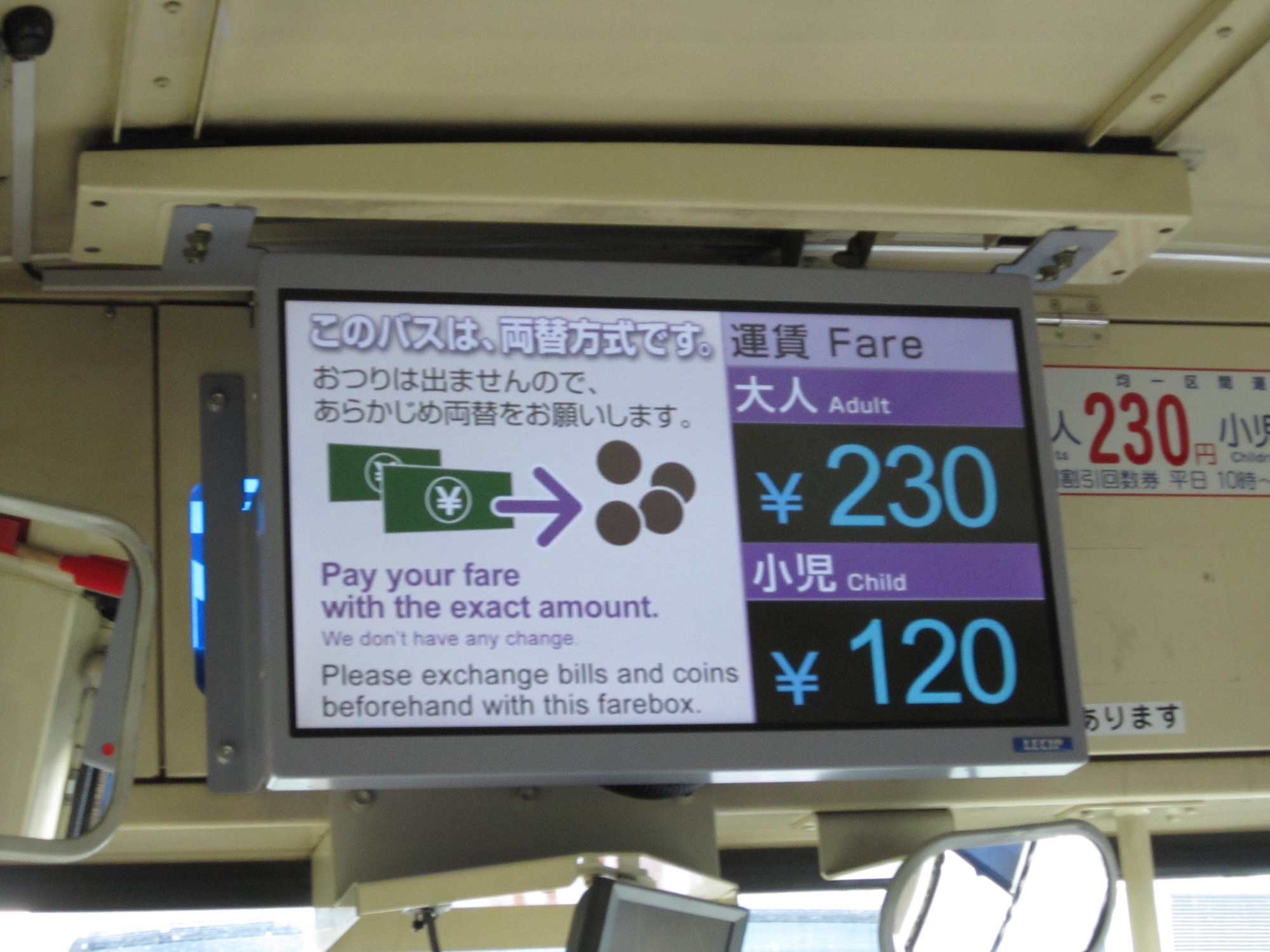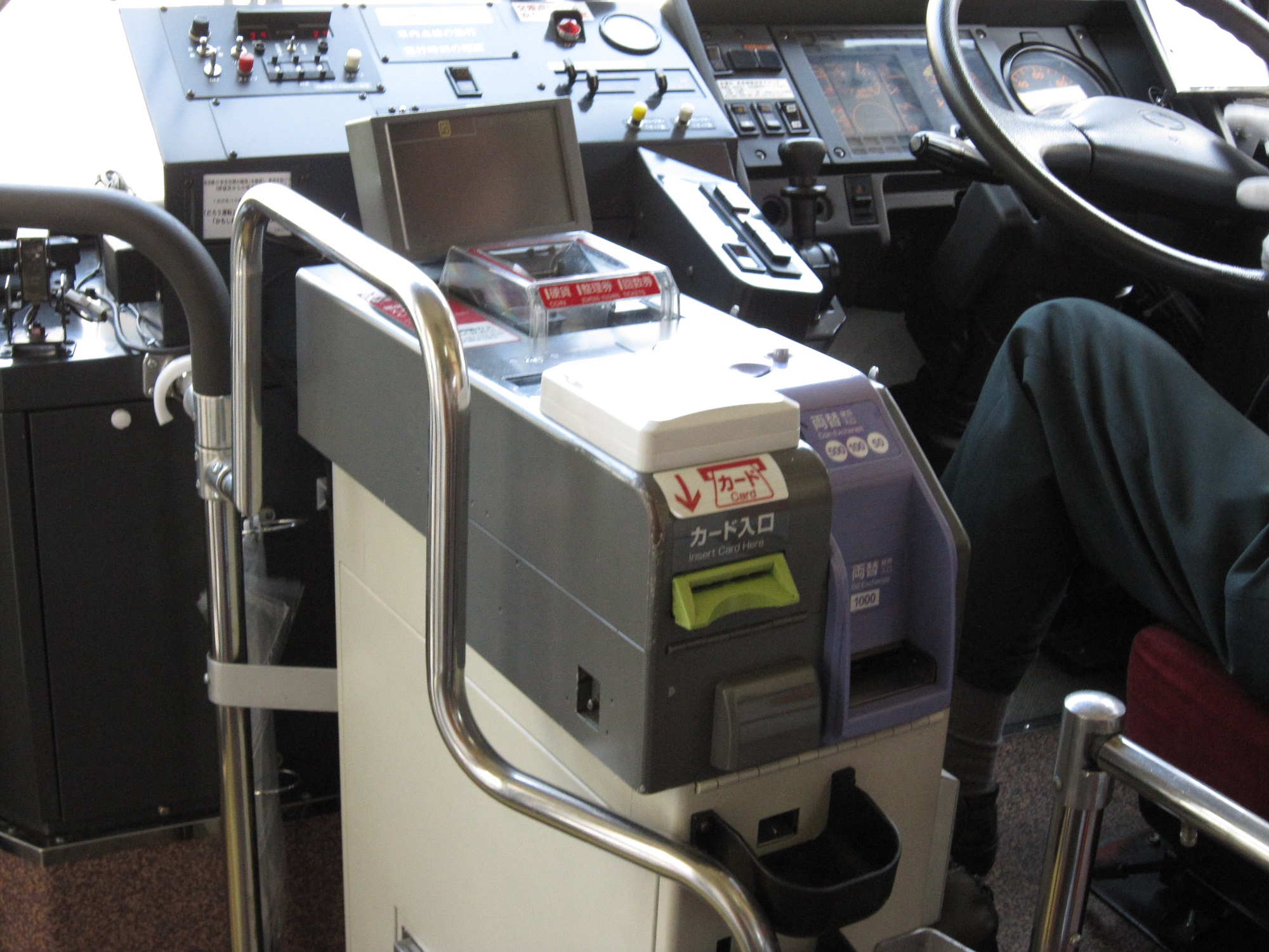 運賃は、降りる際に運賃箱に入れます。整理券式のバスは、整理券と運賃を運賃箱へ入れます。ICカードを利用する場合は、バスを降りる際にICカードリーダーにタッチします。釣銭は出ませんので、降りる前に両替しておきましょう。また、10,000円札や5,000札では両替できません。なので、小銭かICカードをご用意ください。