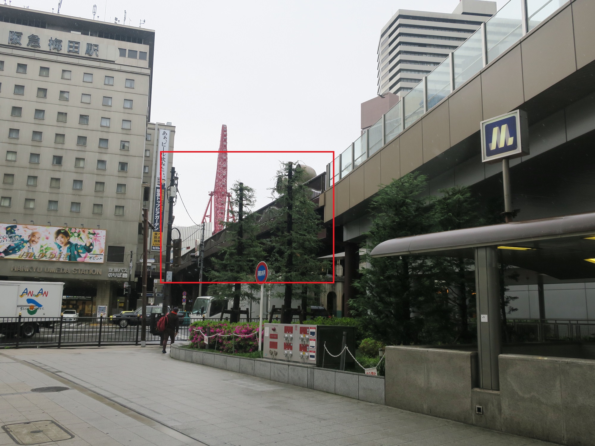 橋を地上から見ると、こんな感じ。赤枠で囲った部分が、高架橋です。で、向かって左側が阪急梅田駅、右側がJR大阪駅です。