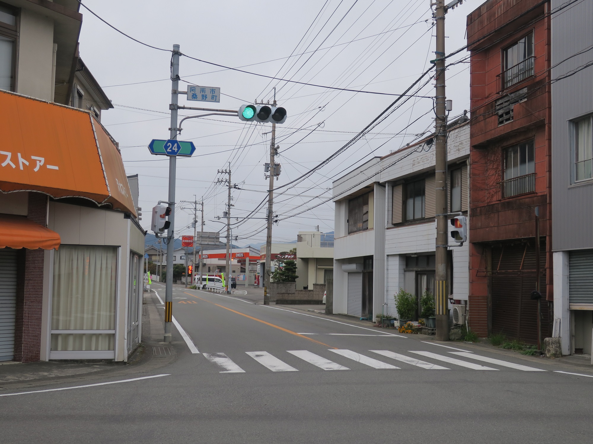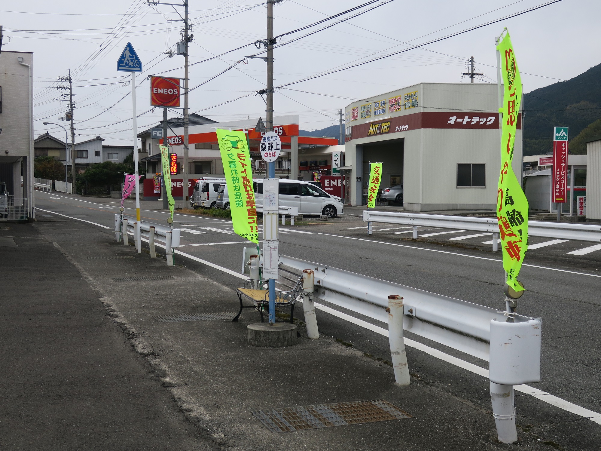 曲がった先のガソリンスタンド付近に、桑野上バス停があります。