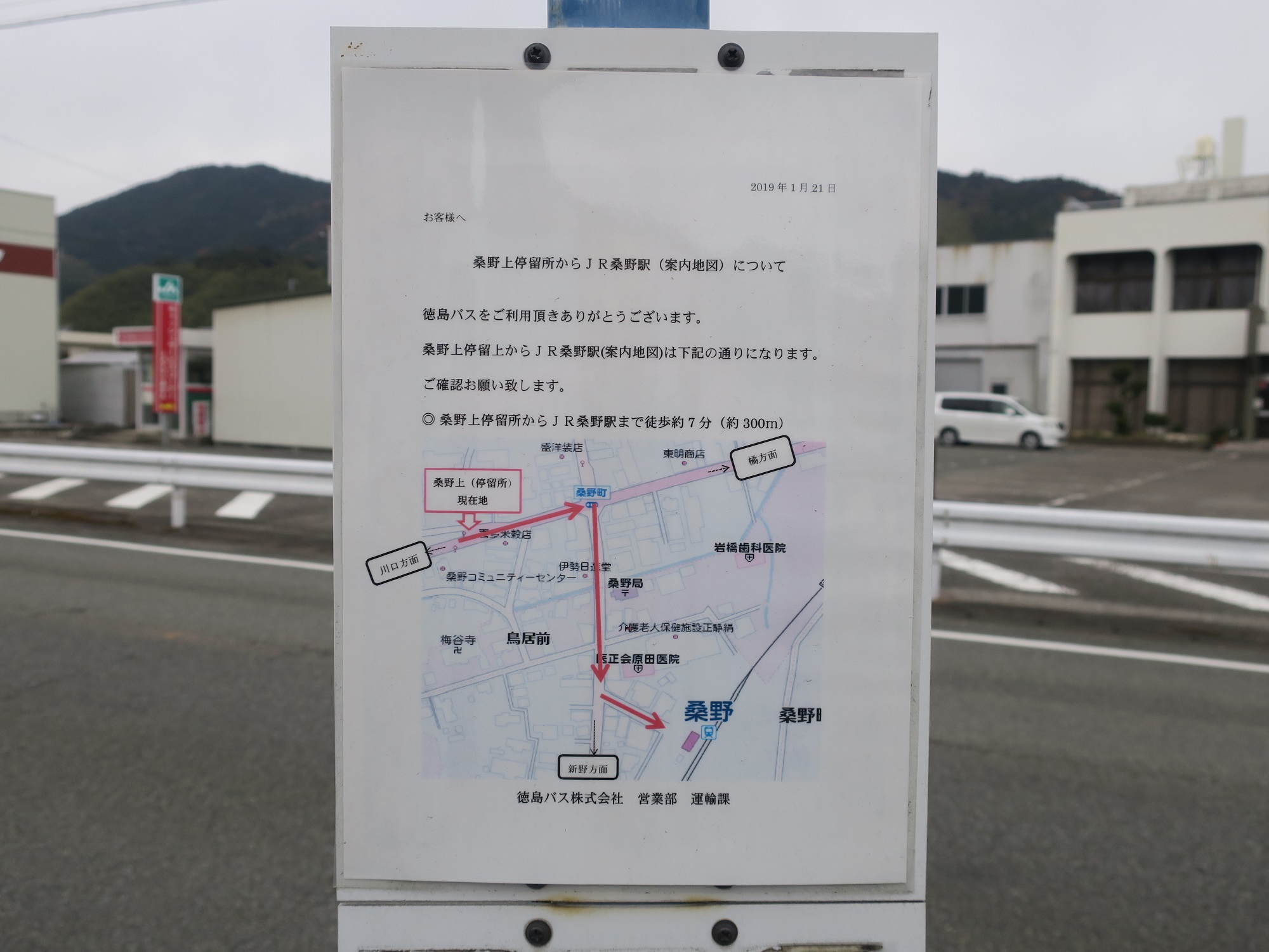桑野駅の最寄りバス停は、桑野上です。こちらが、桑野駅から桑野上バス停への見取り図です。