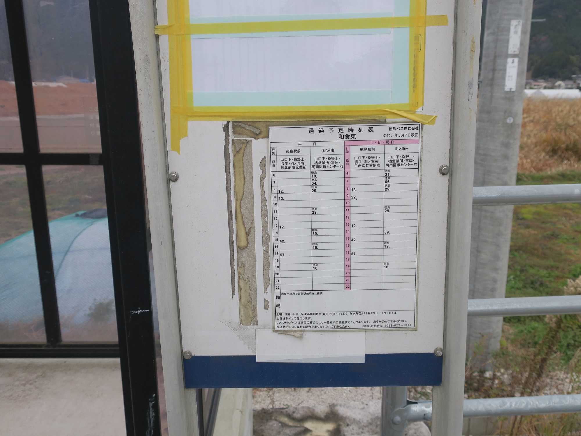 でもって、こちらが桑野上・富岡・徳島駅方面行きのバス停留所です。こちらは、屋根付きの待合所があります。
