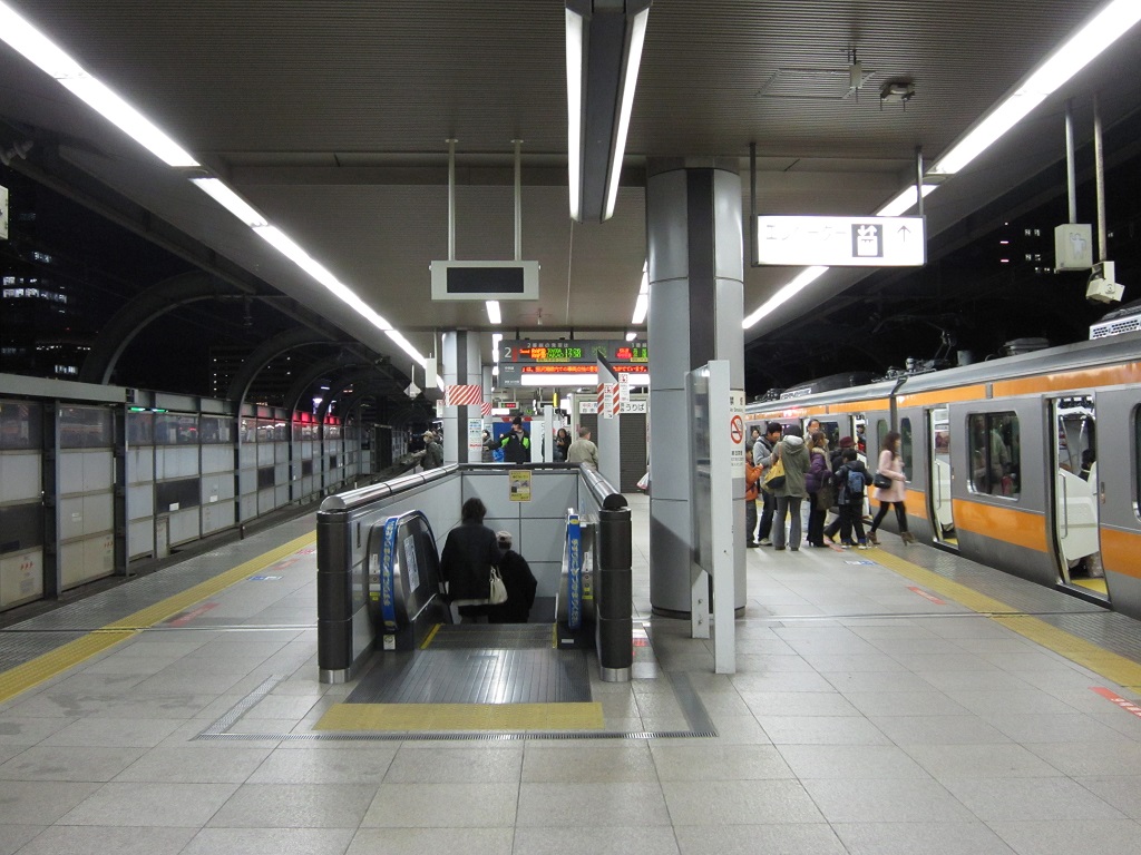 エスカレーターを昇った先が、中央線快速電車のホームです。ここから、新宿・八王子・高雄方面の列車が発着しています。各駅停車は、ここから2つ先の御茶ノ水駅で乗り換えです。