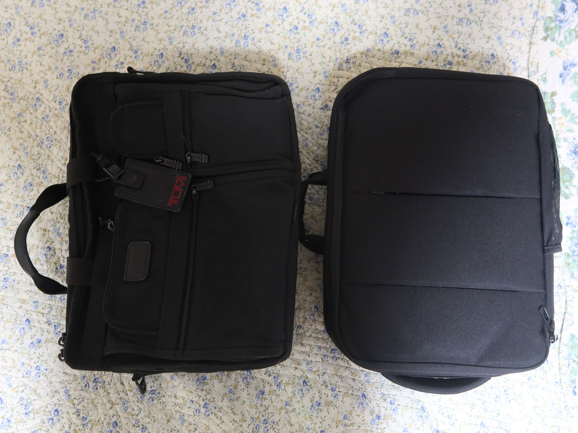 キューティー吉本が以前から使用していた、TUMIのブリーフケースと大きさを比べてみました。このビジネスリュック、小さく見えるのですが実はTUMIのブリーフケースとほぼ同じ大きさなんですね。