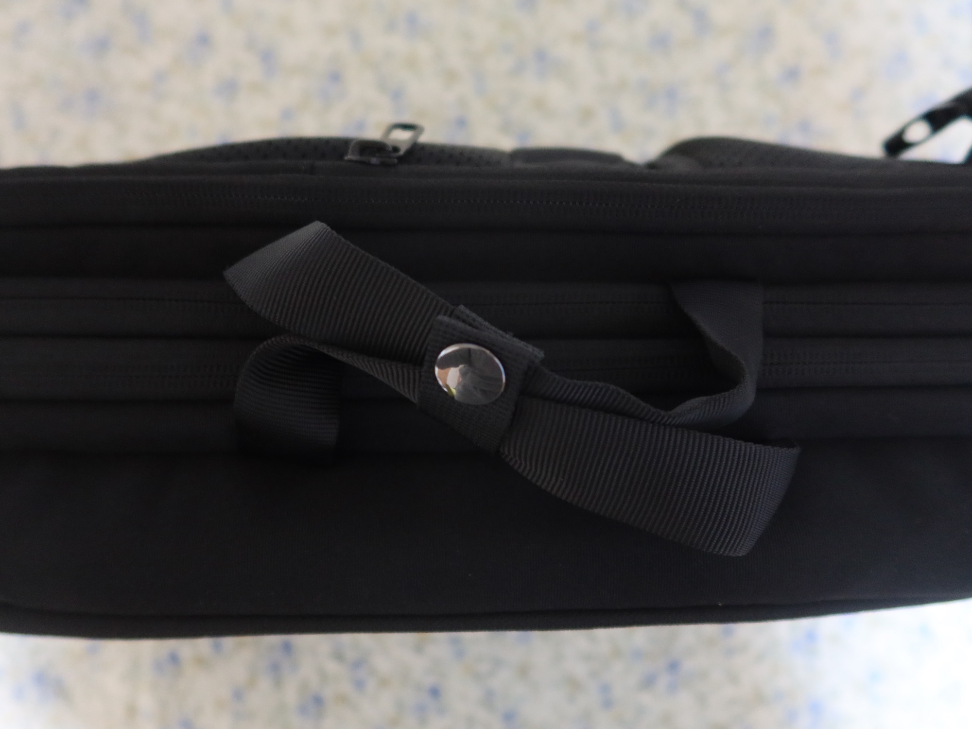 蓋の部分に謎のように付いている袋状の物は一体何かと思ったら、表から出し入れできるポケットでした。スマホやケータイを入れるのに便利かもしれませんが、内側のファスナーを開けると袋状のものがペコペコするってどうにかならなかったのかなぁ・・・と思ってしまいます。(ま、使わなければいいだけの話なのですが)