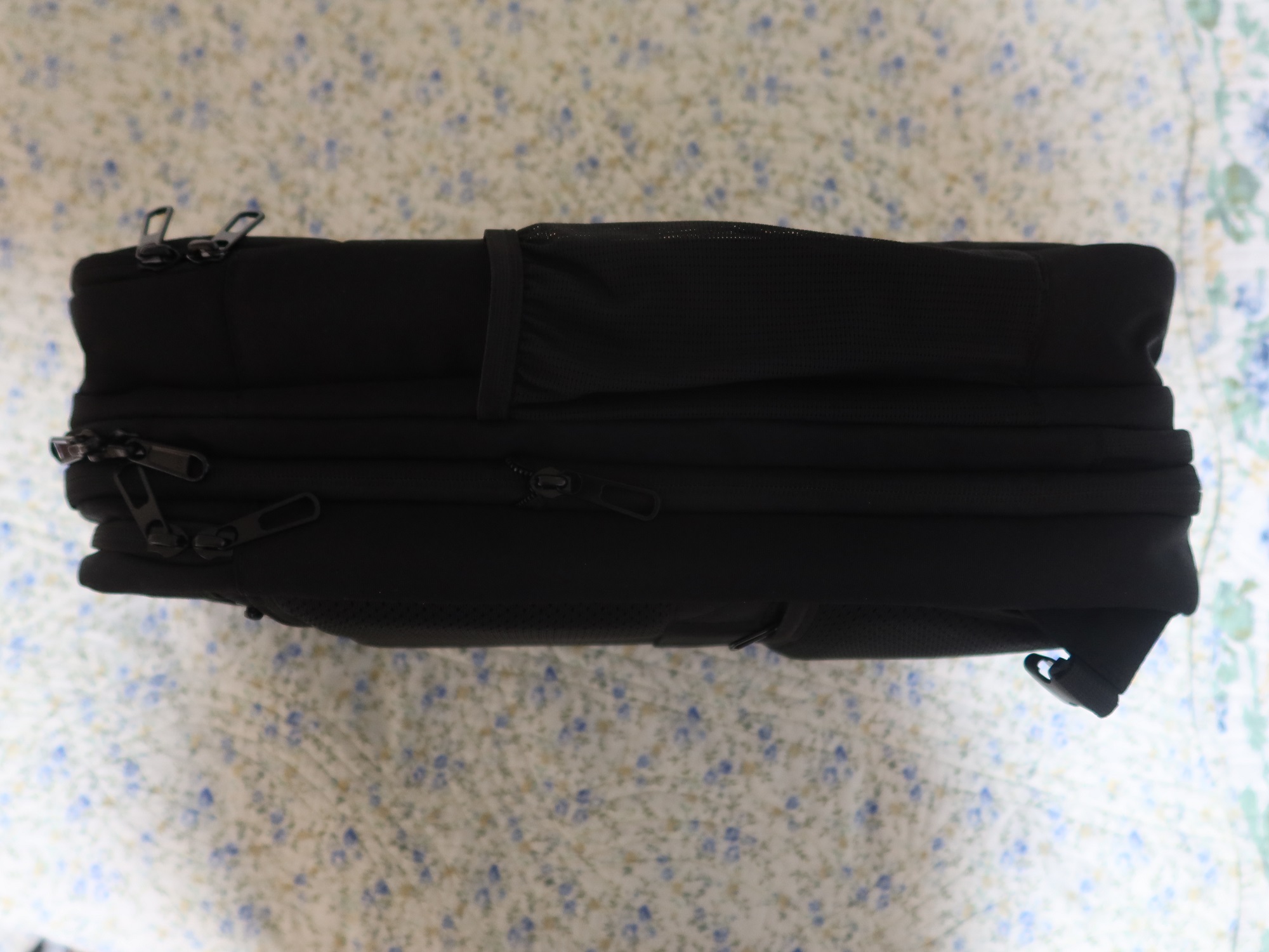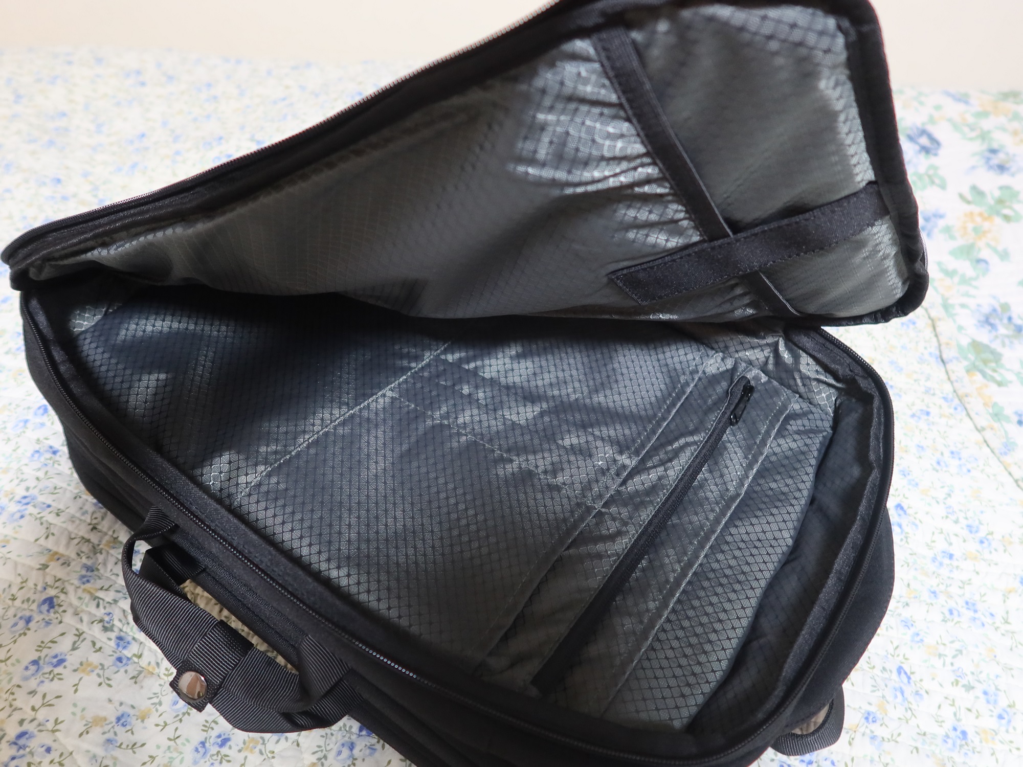 外側のファスナーを開けたところです。出張に行ったときは、ここへ仕事道具を入れることになりそうです。L字型に開くのがミソでして、縦にしても横にしても中身を取り出しやすいです。(ファスナーは2つある)