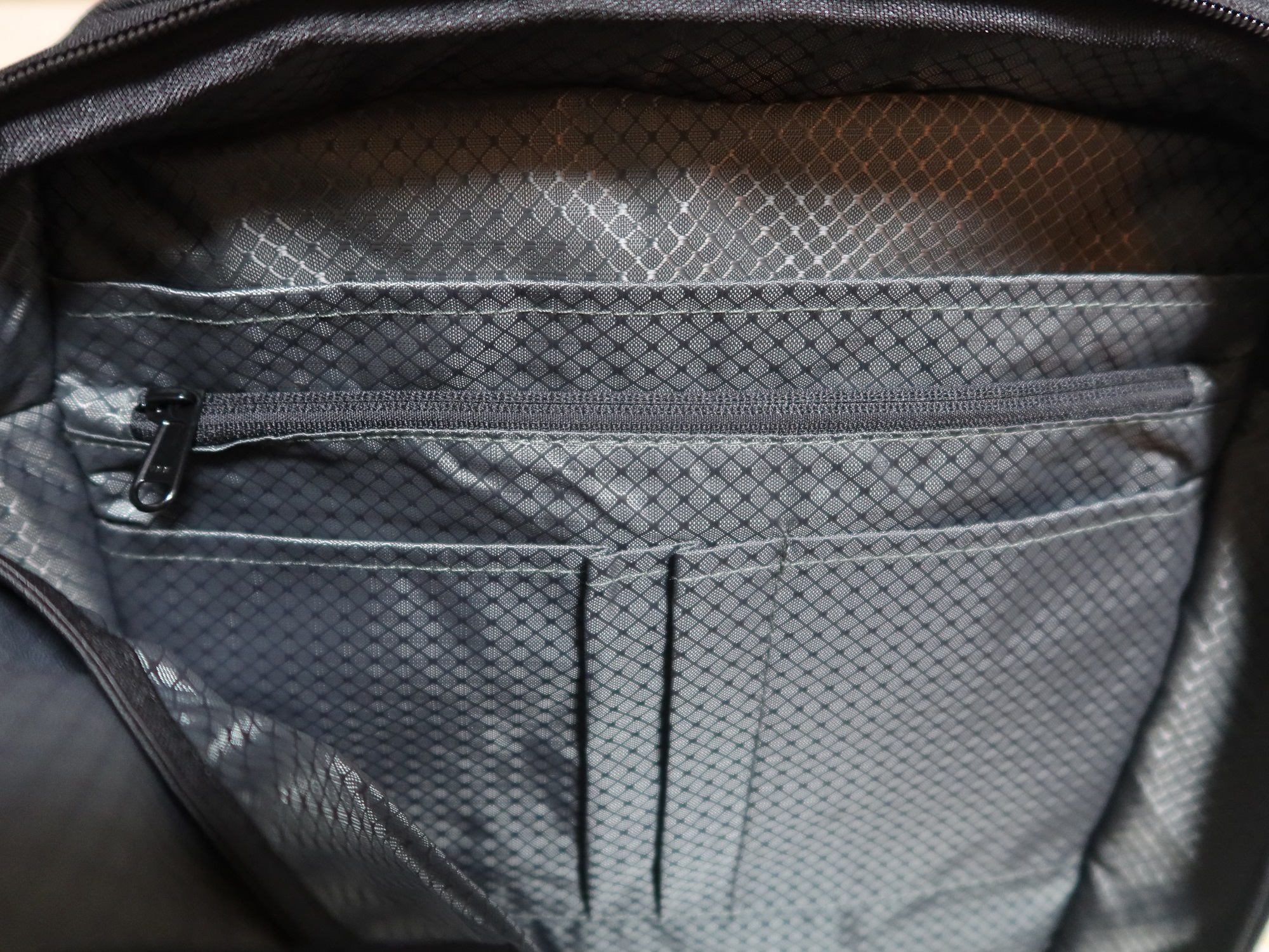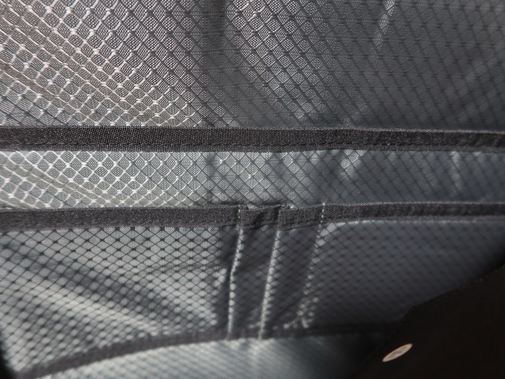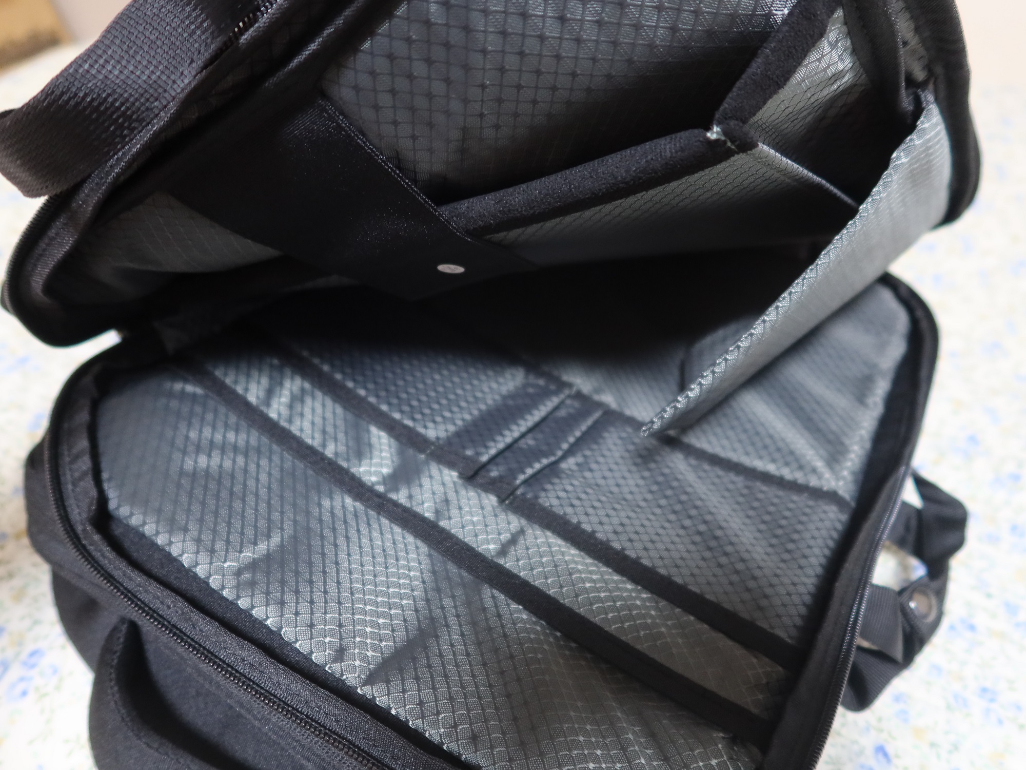 内側のファスナーを開けたところです。大型のポケットが付いていて、靴を入れることもできます。出張へ行ったときには、私物をここへ入れることになりそうです。