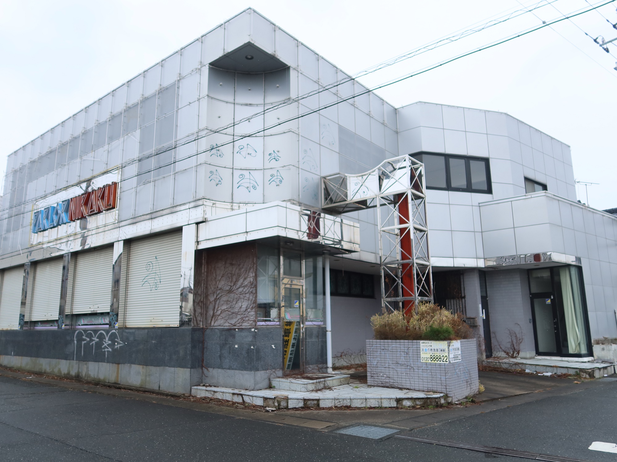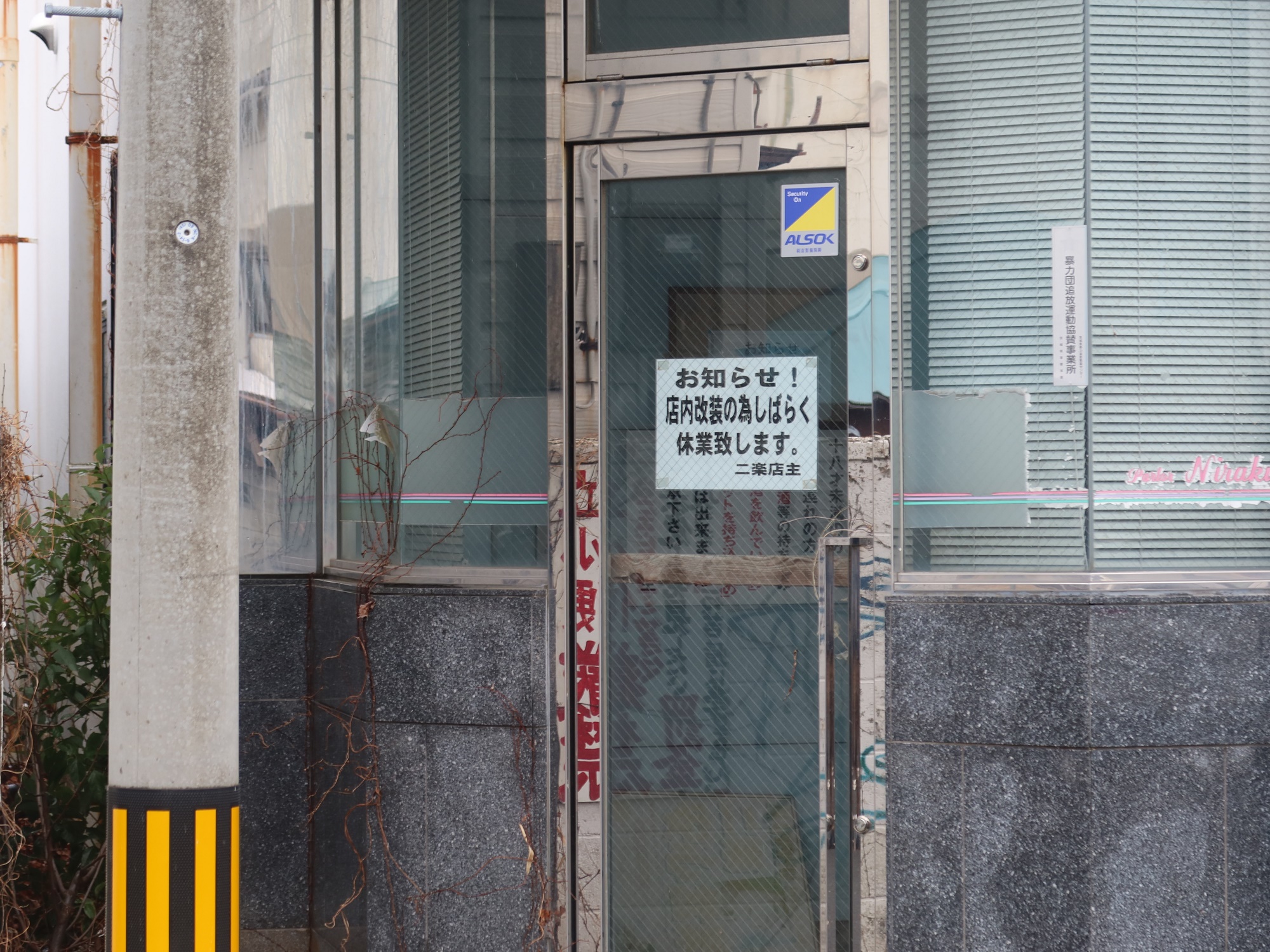 このパチンコ店、張り紙に「店内改装の為しばらく休業致します」と書いてあるのですが、店内改装中には見えず、どう見ても閉店してから何年も経っている感じです。