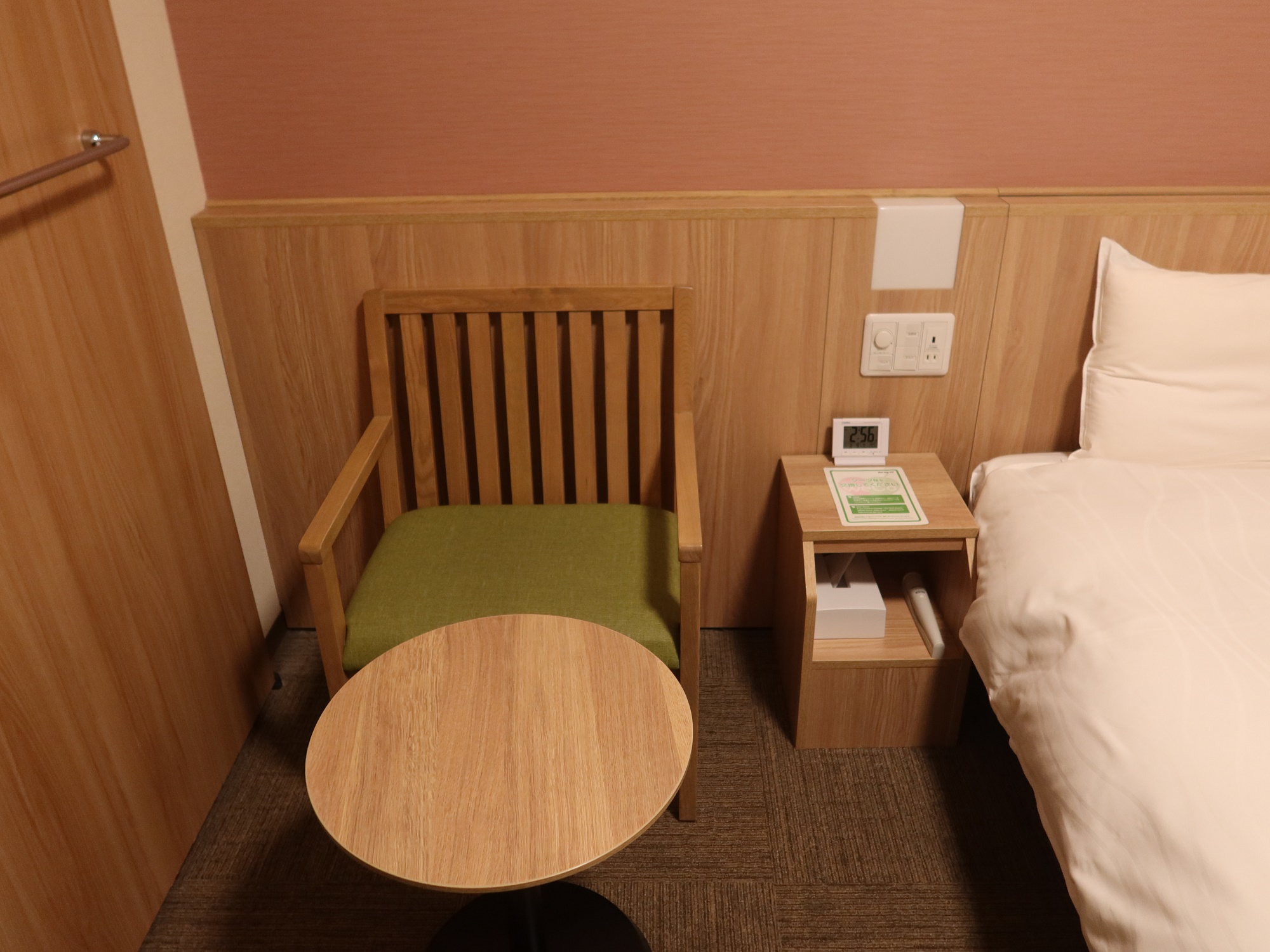 ベッドの隣には、テーブルと椅子が置いてあります。お部屋の広さも相まって、