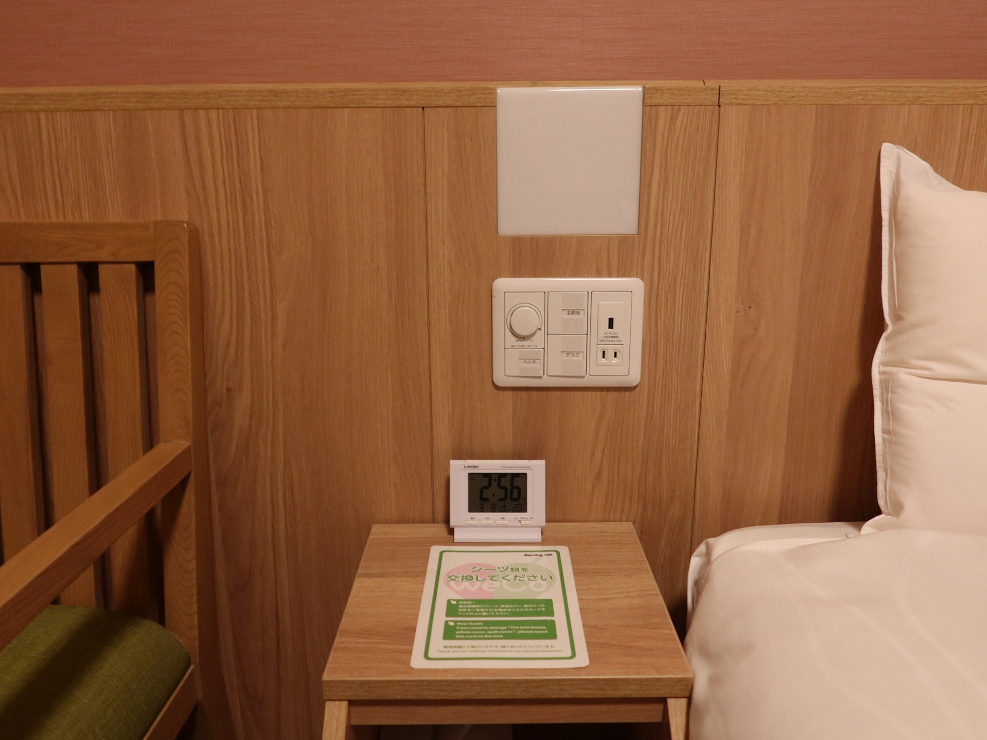 枕元にはACコンセントとケータイ・スマホ充電用のUSBポート、明かりのスイッチがあります。また、ベッド脇にもサイドテーブルがあります。