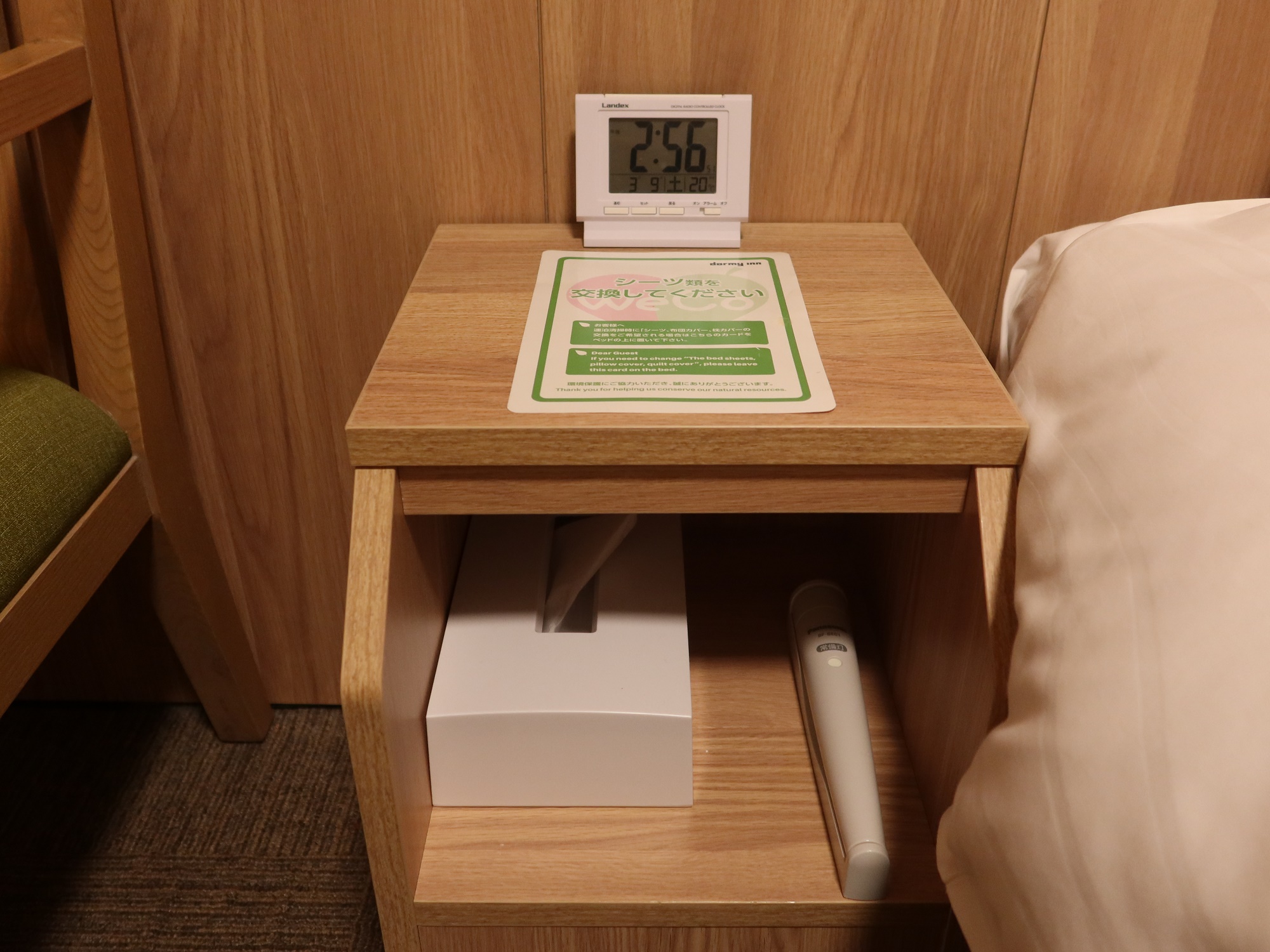 サイドテーブルの上には目覚まし時計、下にはティッシュと非常灯があります。