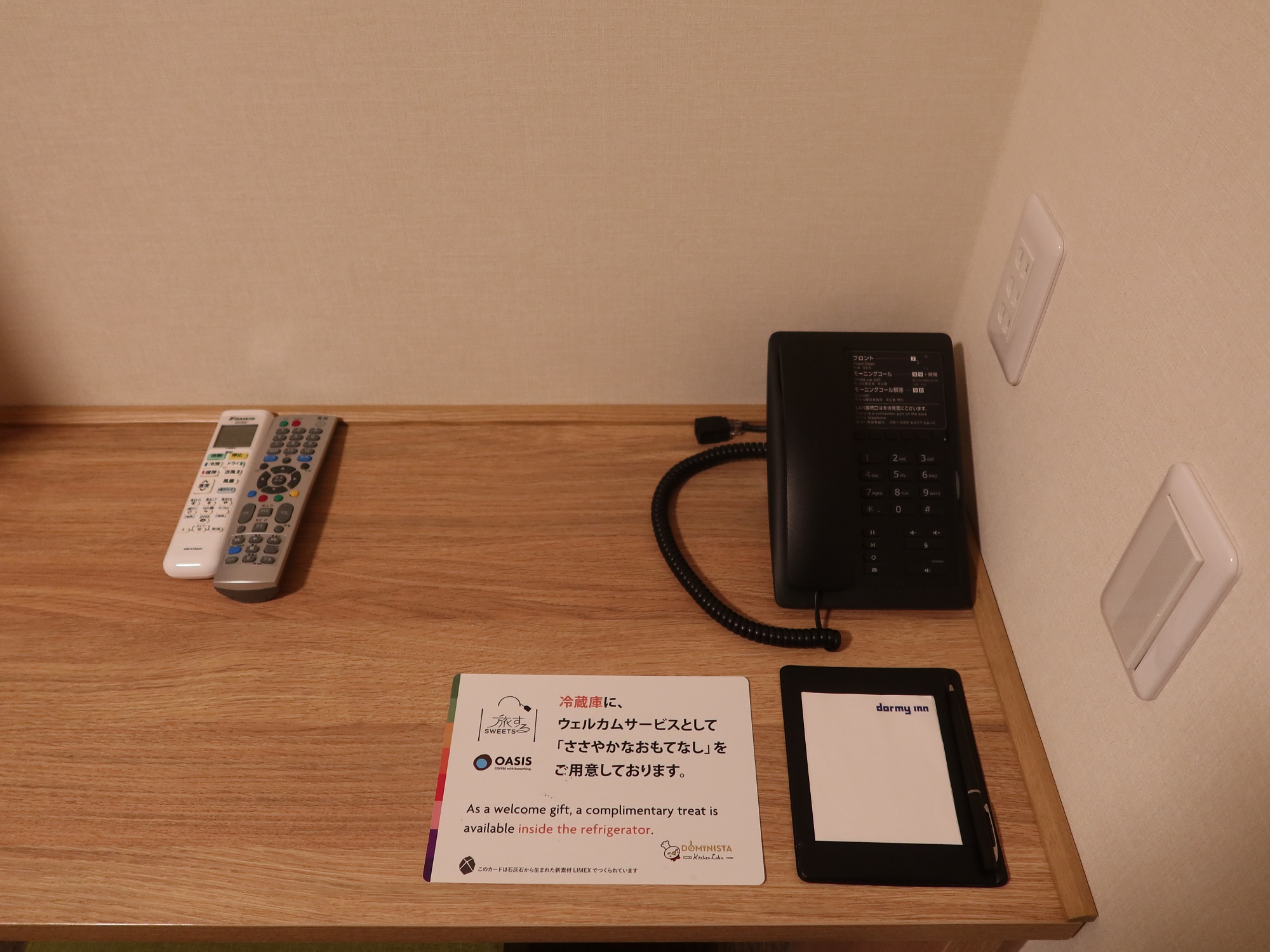 デスク上です。ACコンセントと明かりのスイッチ、電話機、メモ帳、テレビと電話のリモコンがあります。インターネットは有線LAN・無線LAN共に利用可能で、電話機の脇にLANケーブルが伸びています。