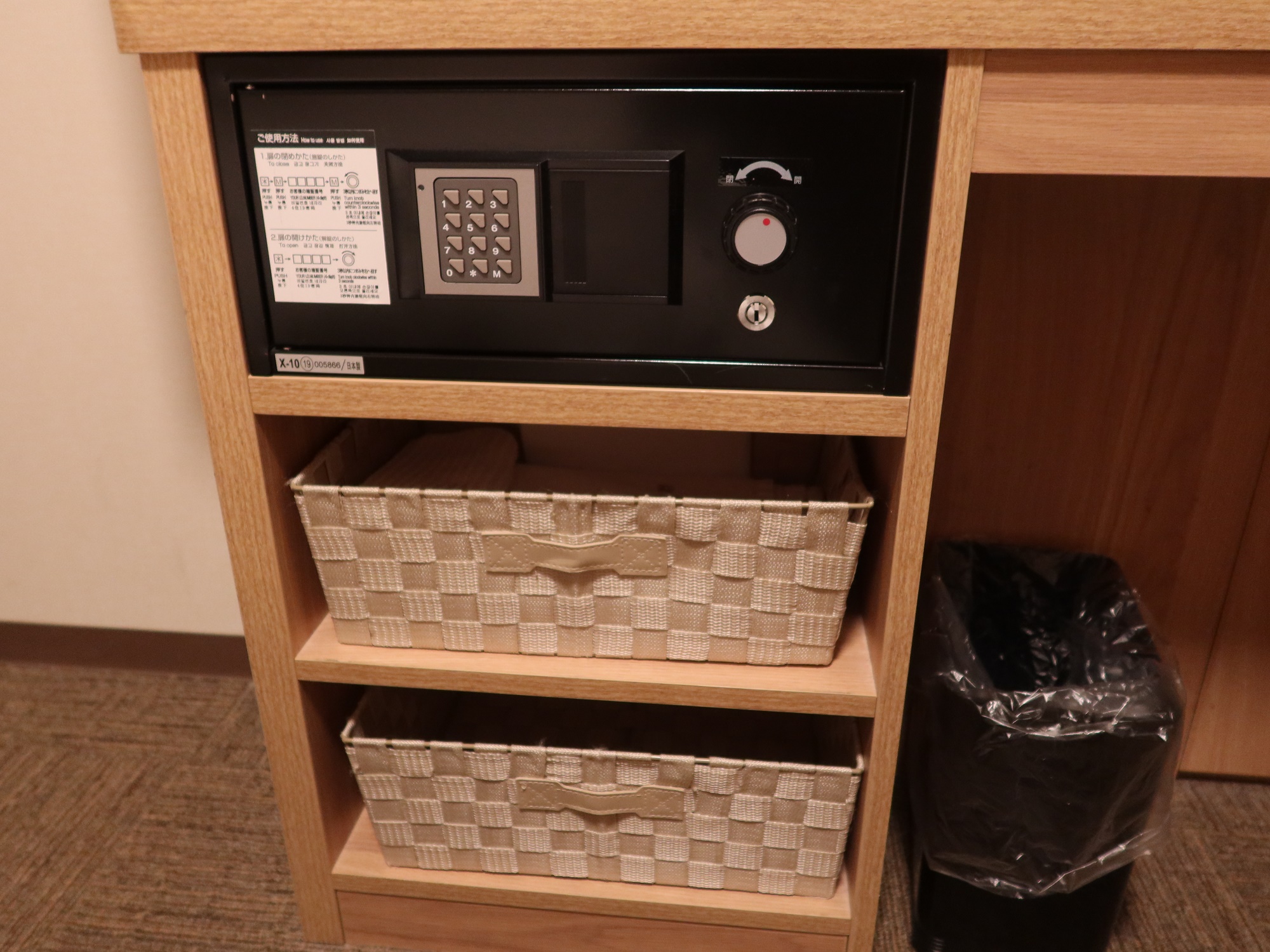 デスク下です。ちょうど液晶テレビの下あたりに、金庫とタオル入れ、ごみ箱があります。